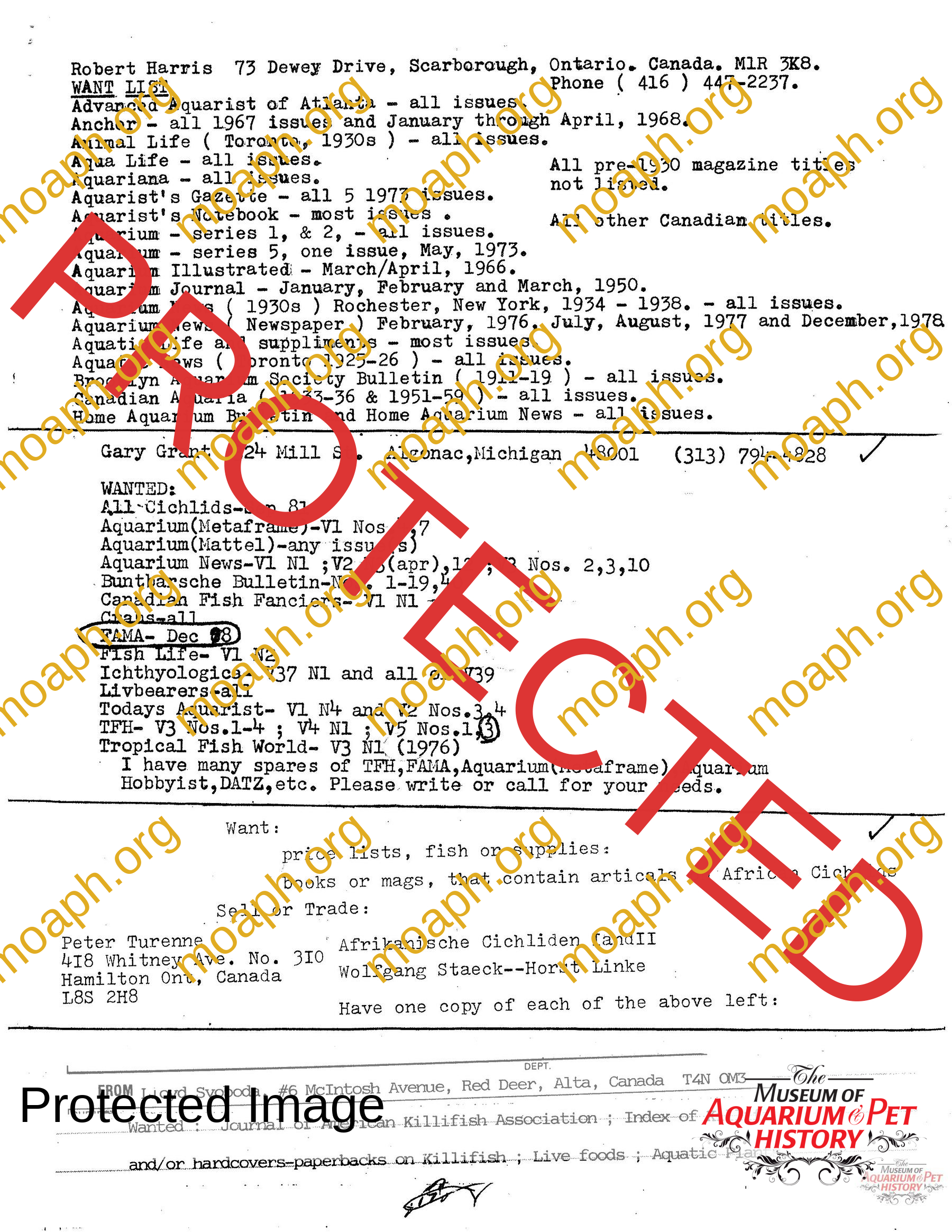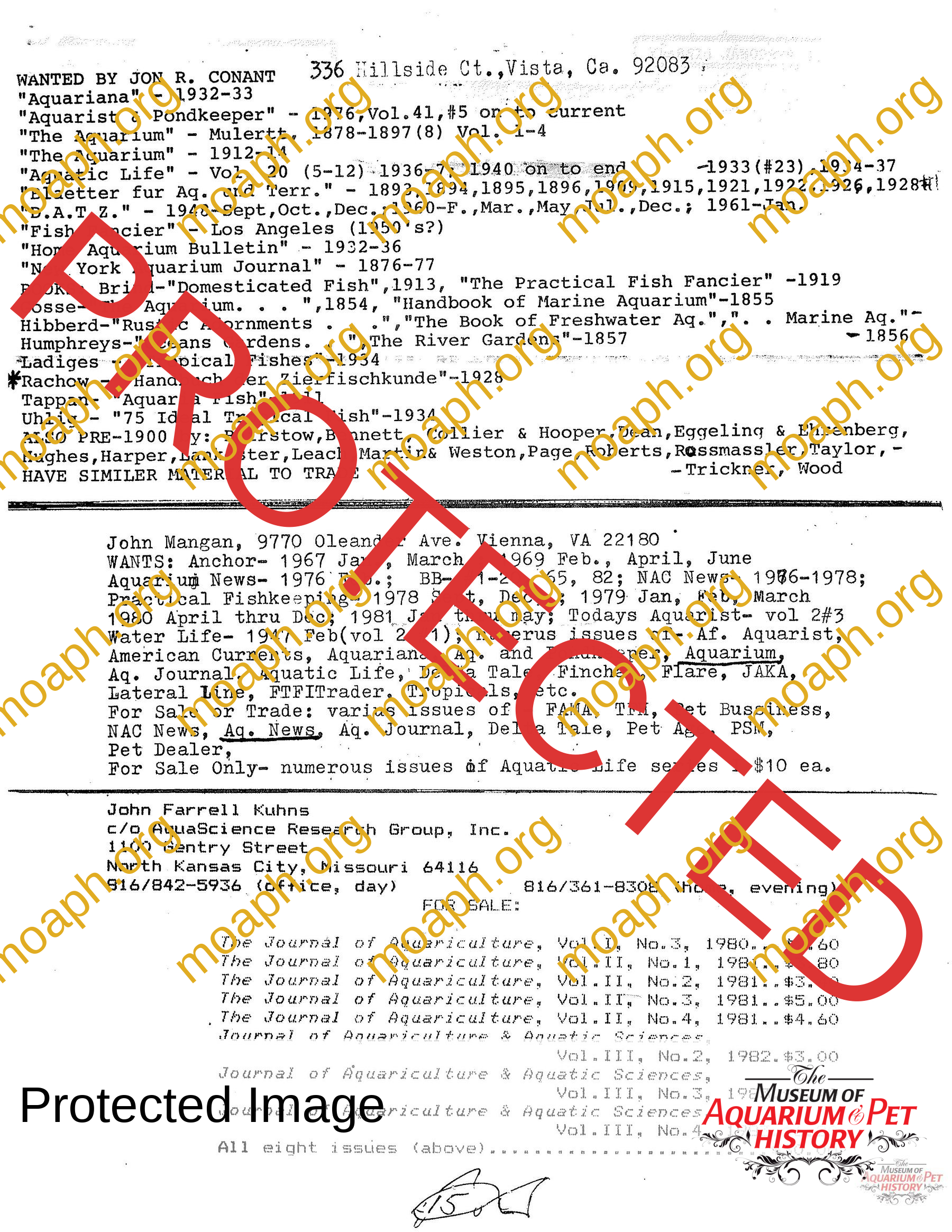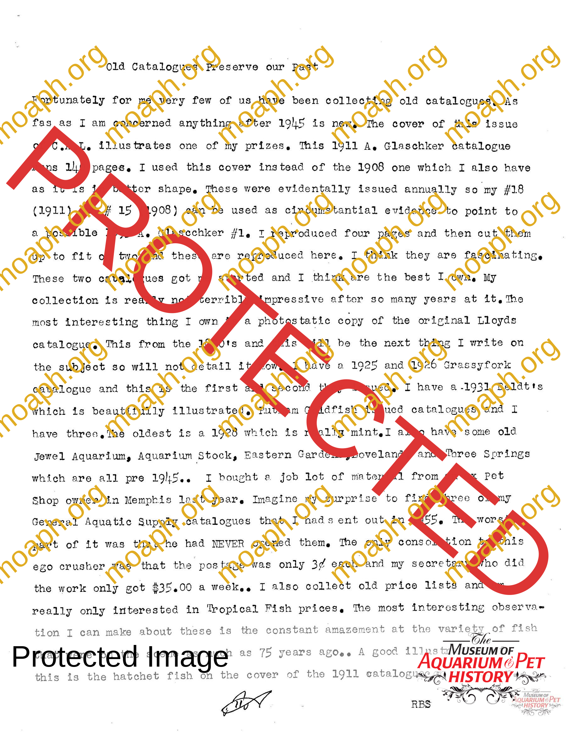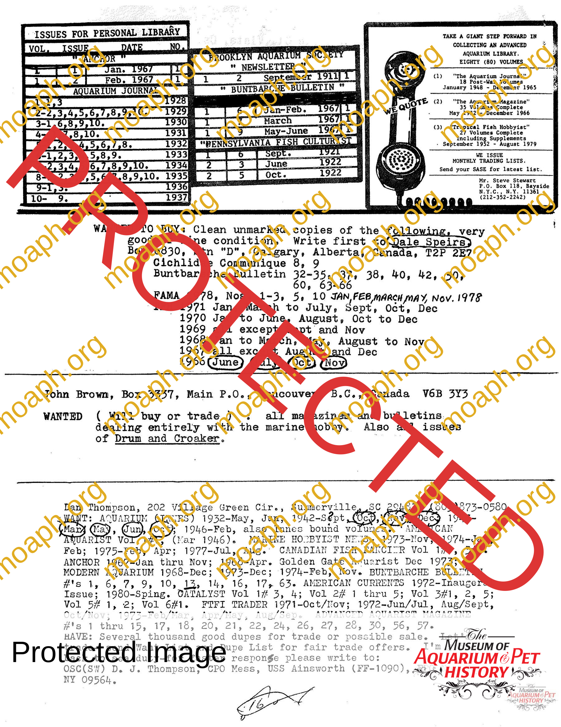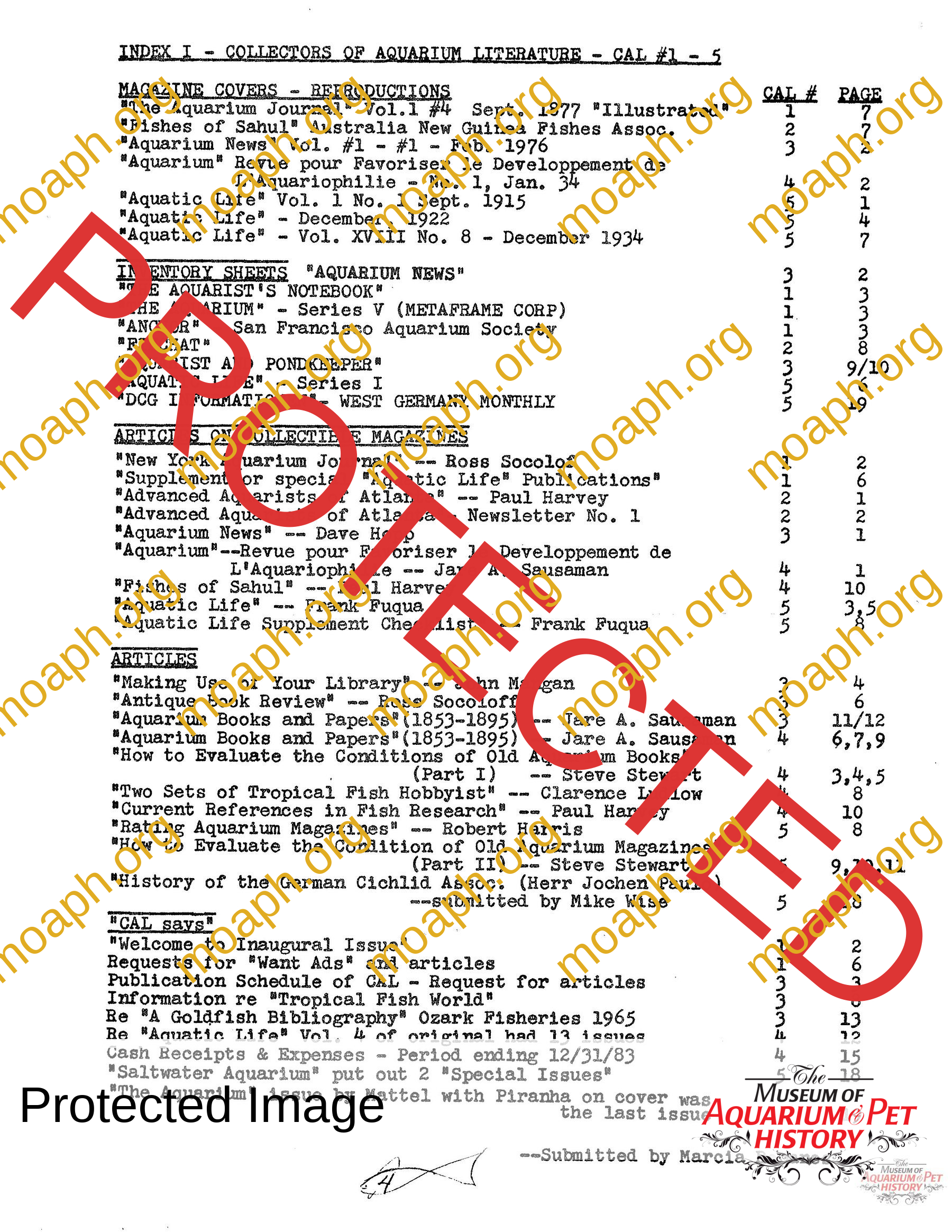 The collectors of aquarium literature was an organization founded by Dave Hopp and Paul Harvey to better organize those who collected vintage aquarium magazines and books. Each issue had articles on aquarium publication history plus articles related to book and magazine collecting in general. This publication ran from May 1983 through June 1994 for a total of 55 issues. (August through November 1988 was a combined issue 25/26 and March through July 1989 was marked 29/30 1989.)