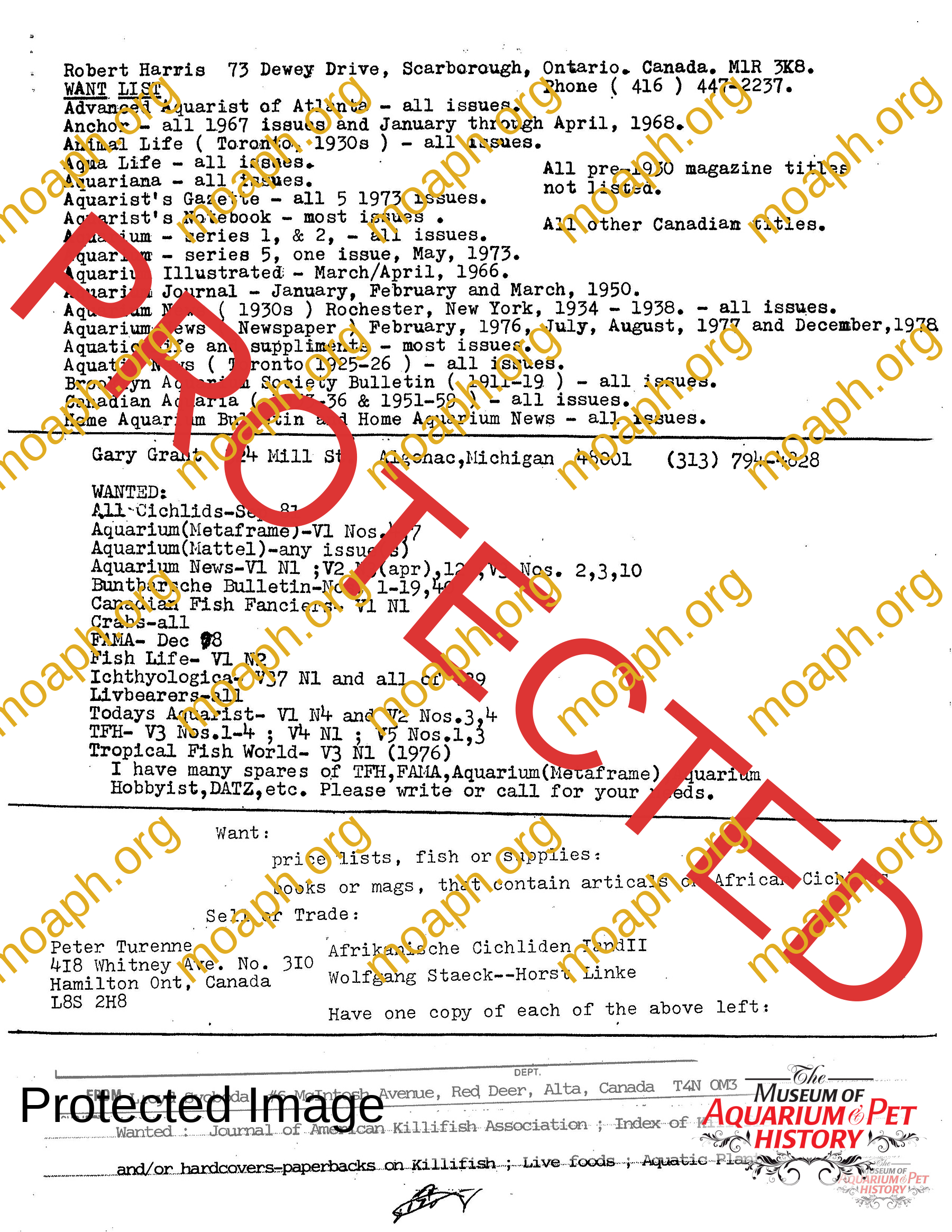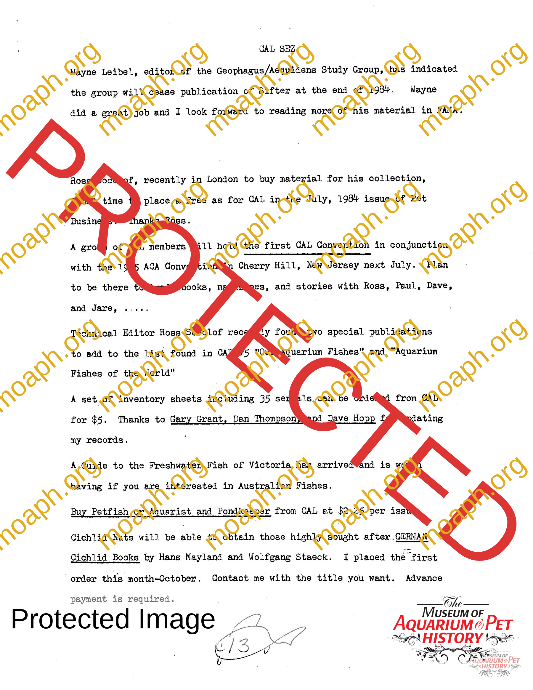 The collectors of aquarium literature was an organization founded by Dave Hopp and Paul Harvey to better organize those who collected vintage aquarium magazines and books. Each issue had articles on aquarium publication history plus articles related to book and magazine collecting in general. This publication ran from May 1983 through June 1994 for a total of 55 issues. (August through November 1988 was a combined issue 25/26 and March through July 1989 was marked 29/30 1989.)