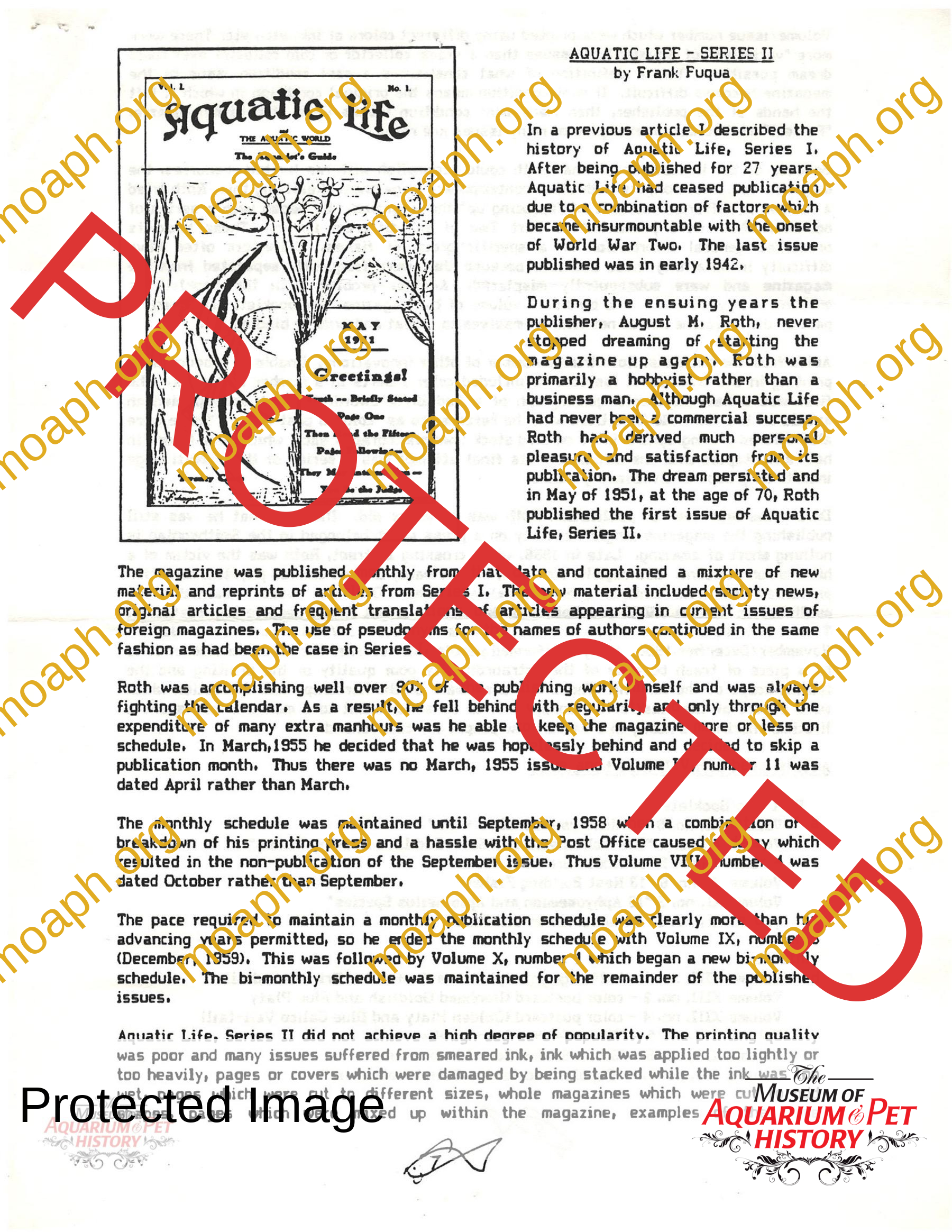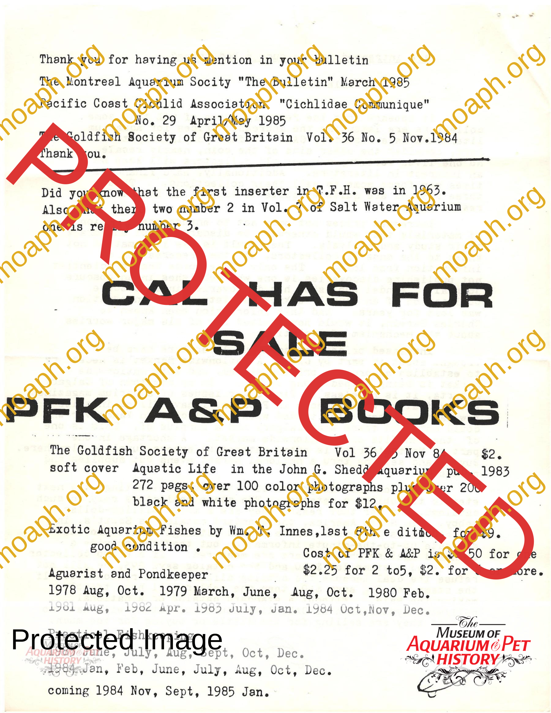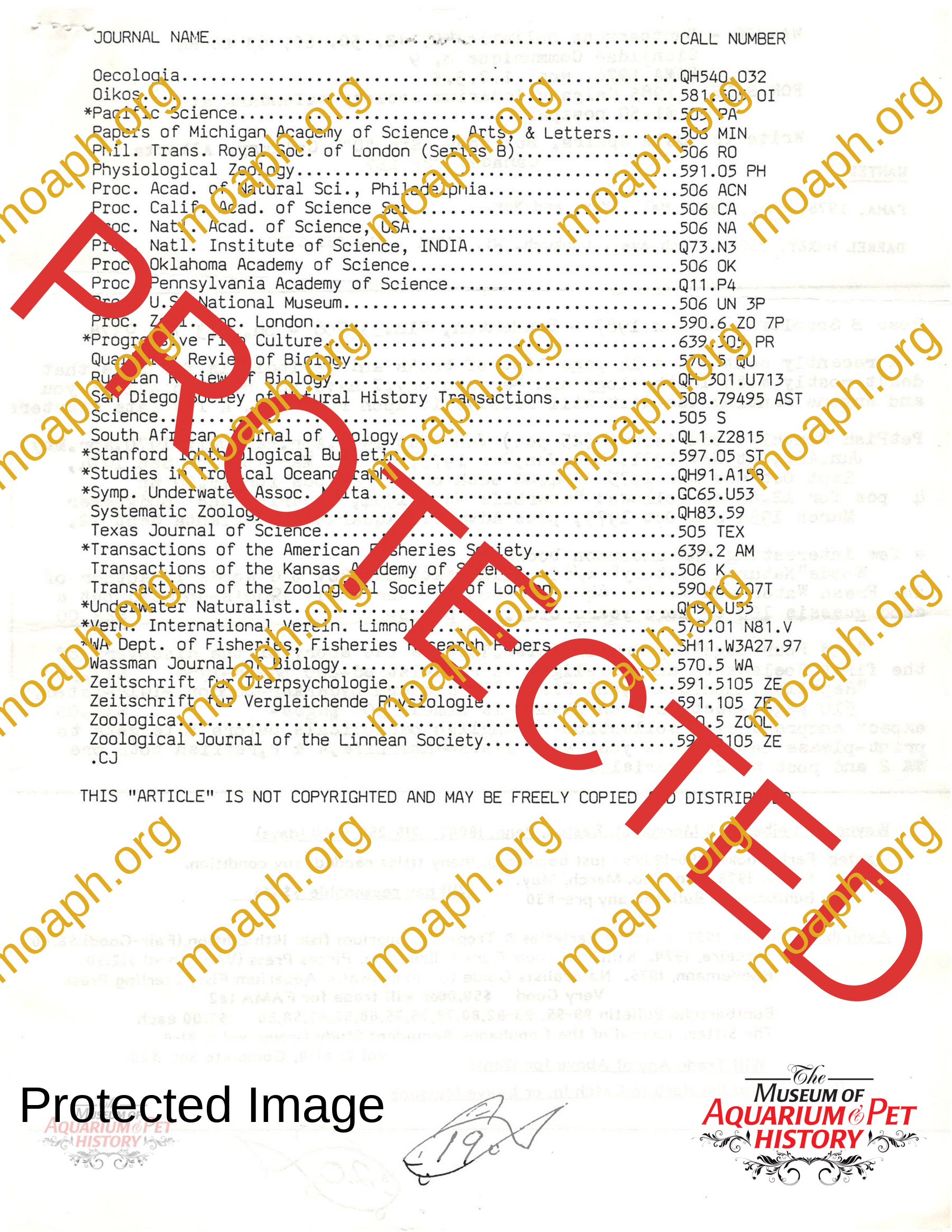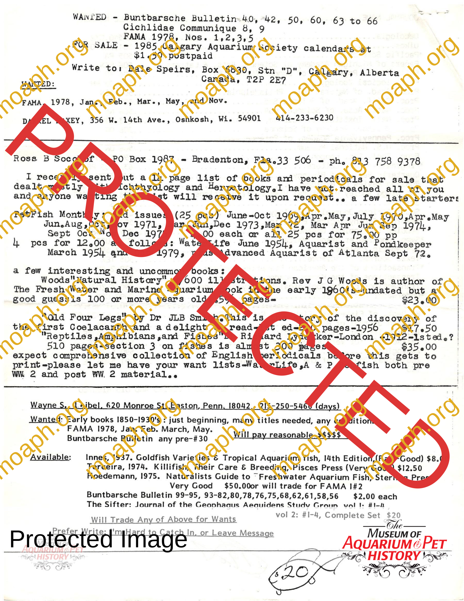 The collectors of aquarium literature was an organization founded by Dave Hopp and Paul Harvey to better organize those who collected vintage aquarium magazines and books. Each issue had articles on aquarium publication history plus articles related to book and magazine collecting in general. This publication ran from May 1983 through June 1994 for a total of 55 issues. (August through November 1988 was a combined issue 25/26 and March through July 1989 was marked 29/30 1989.)