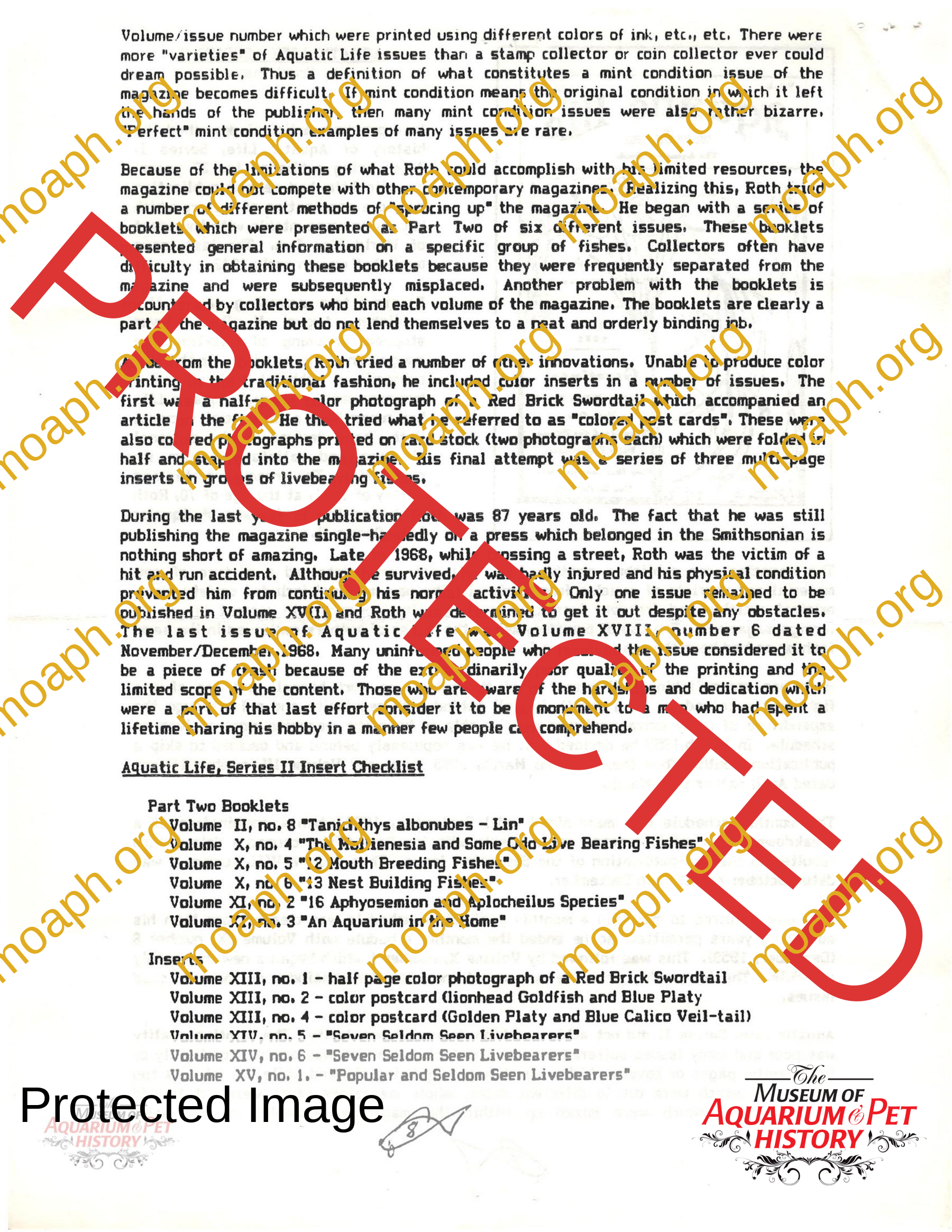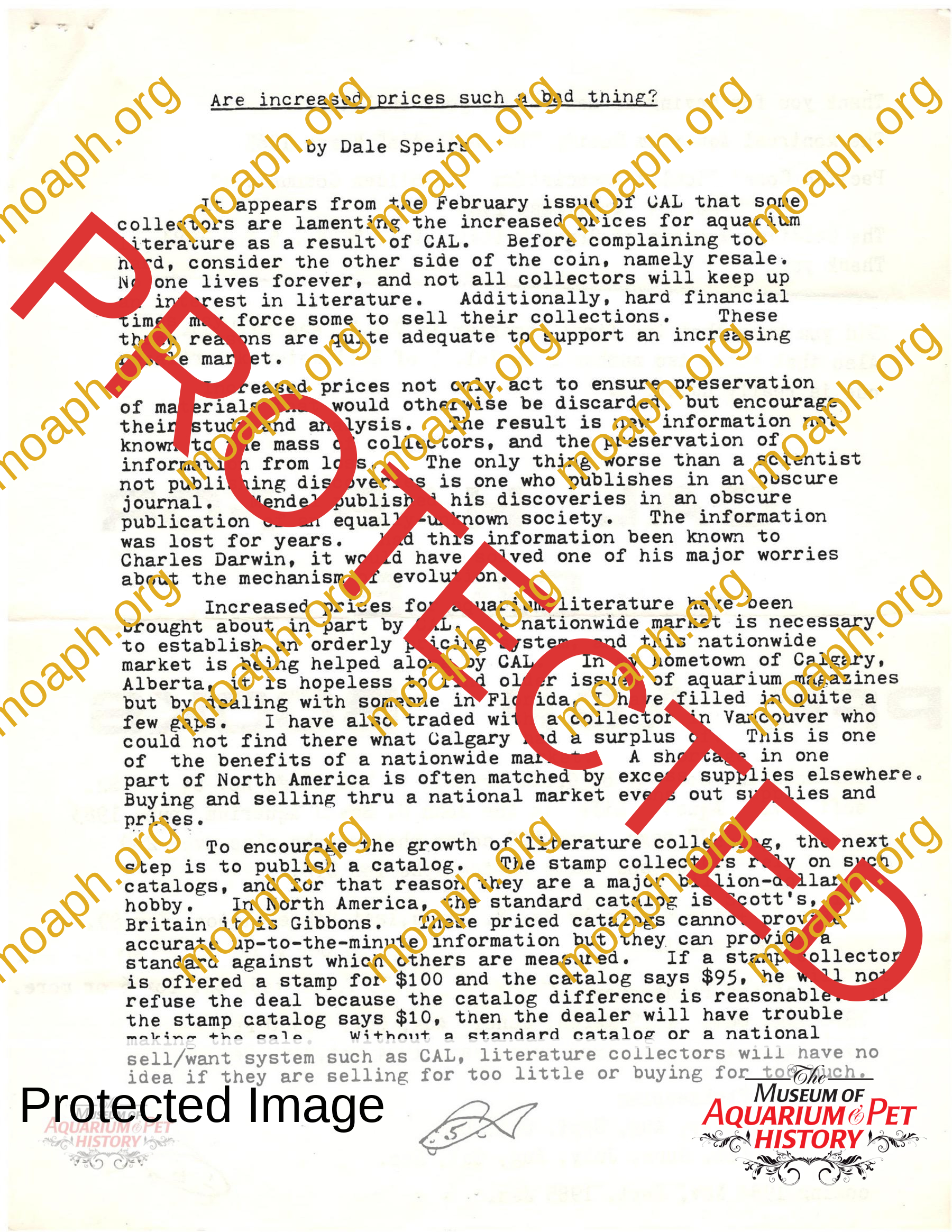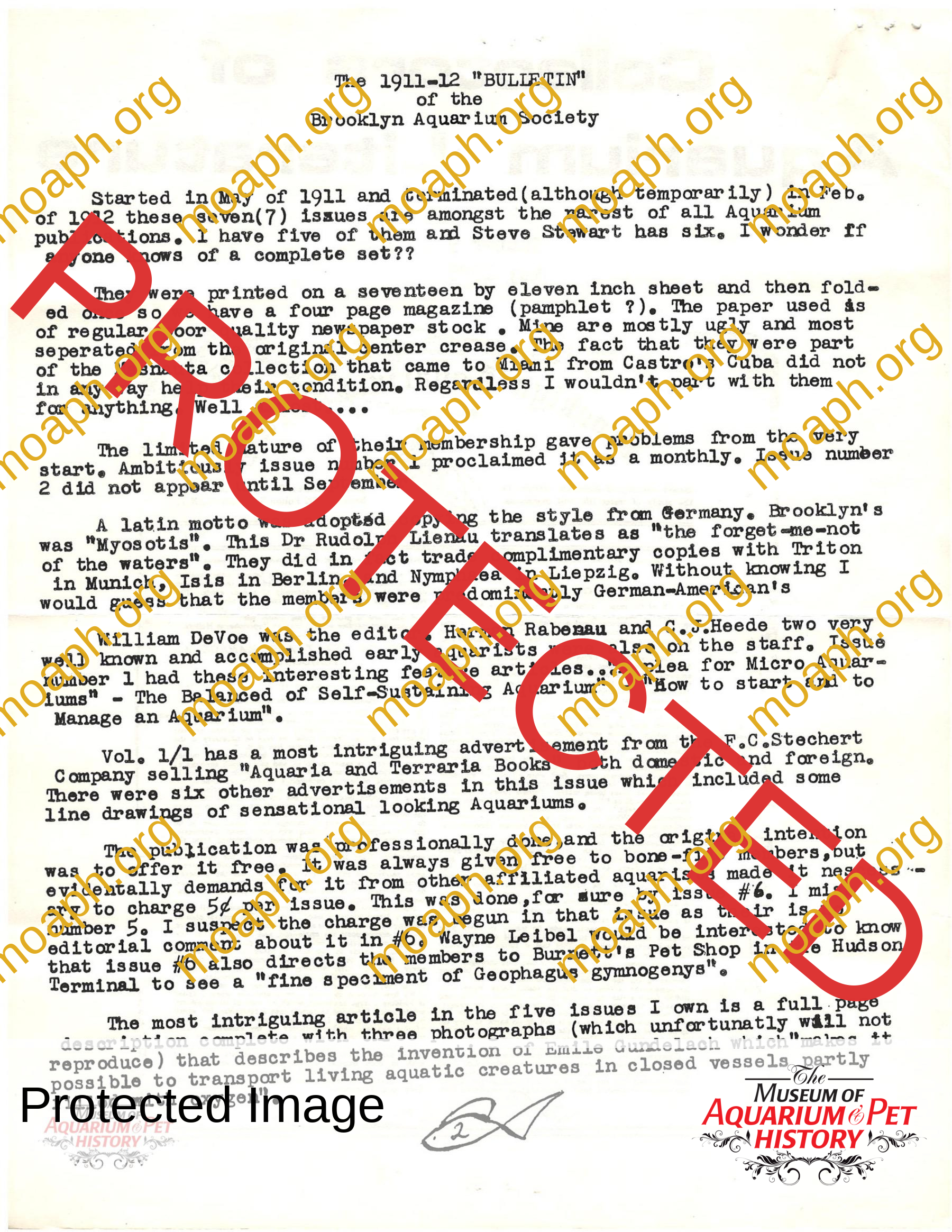 The collectors of aquarium literature was an organization founded by Dave Hopp and Paul Harvey to better organize those who collected vintage aquarium magazines and books. Each issue had articles on aquarium publication history plus articles related to book and magazine collecting in general. This publication ran from May 1983 through June 1994 for a total of 55 issues. (August through November 1988 was a combined issue 25/26 and March through July 1989 was marked 29/30 1989.)