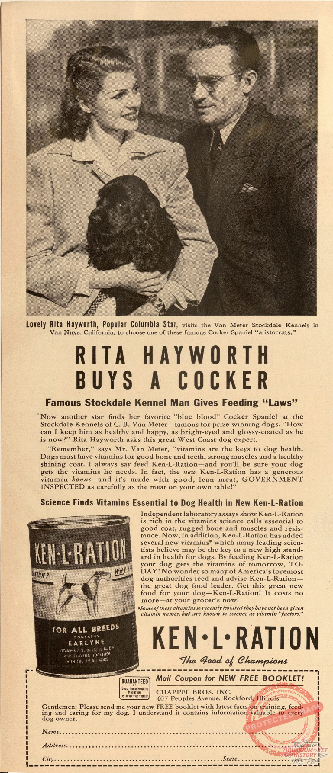 Back to Gallery Rita Hayworth Buys a Cocker SpanielJan 9, 2026 Famous actress Rita Hayworth purchases a cocker spaniel from Stockdale Kennels in Van Nuys, California.