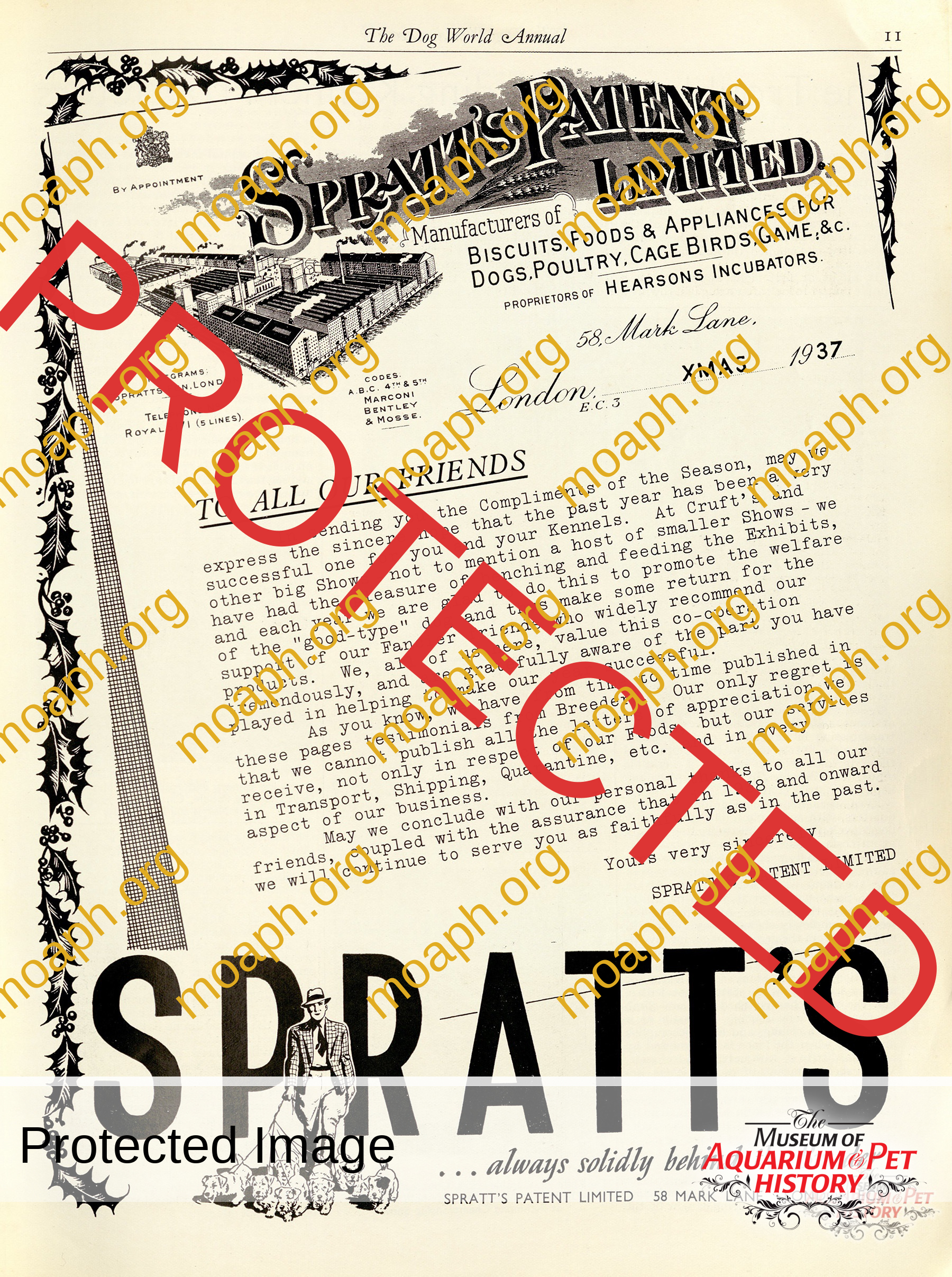 Back to Gallery Spratt’s 1938 AdJan 10, 2025 An advertisement for Spratt’s Company from 1938. Notice how huge the factory is in the letterhead illustration. The company buildings are still in England today and repurposed as luxury condominiums! From 1938 edition of Dog World Annual.