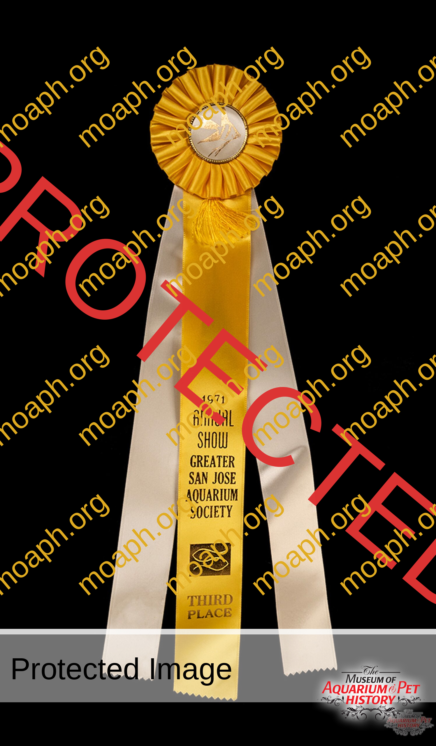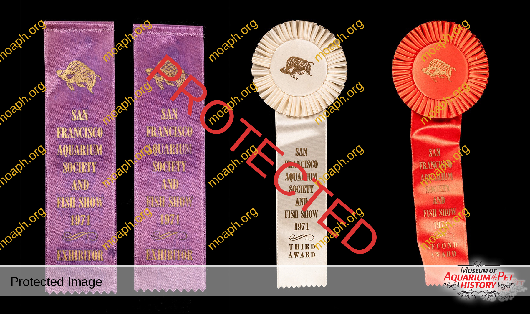 1960s-1970s era aquarium society ribbons from the Davis Aquarium Society, Peninsula Aquarium Society, Sacramento Aquarium Society, Salinas Aquarium Society, San Francisco Aquarium Society, and the San Jose Aquarium Society.