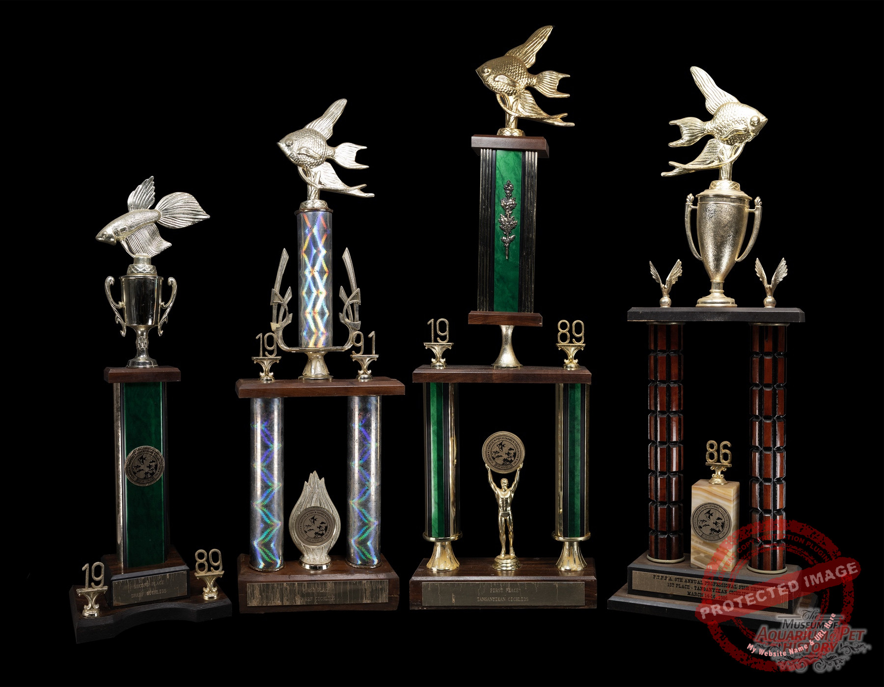 Variety of trophies for dwarf cichlids and Tanganyikan cichlids awarded from 1986-1991. Trophies were won and donated by Laif DeMason. Watch the video where we unbox these below.