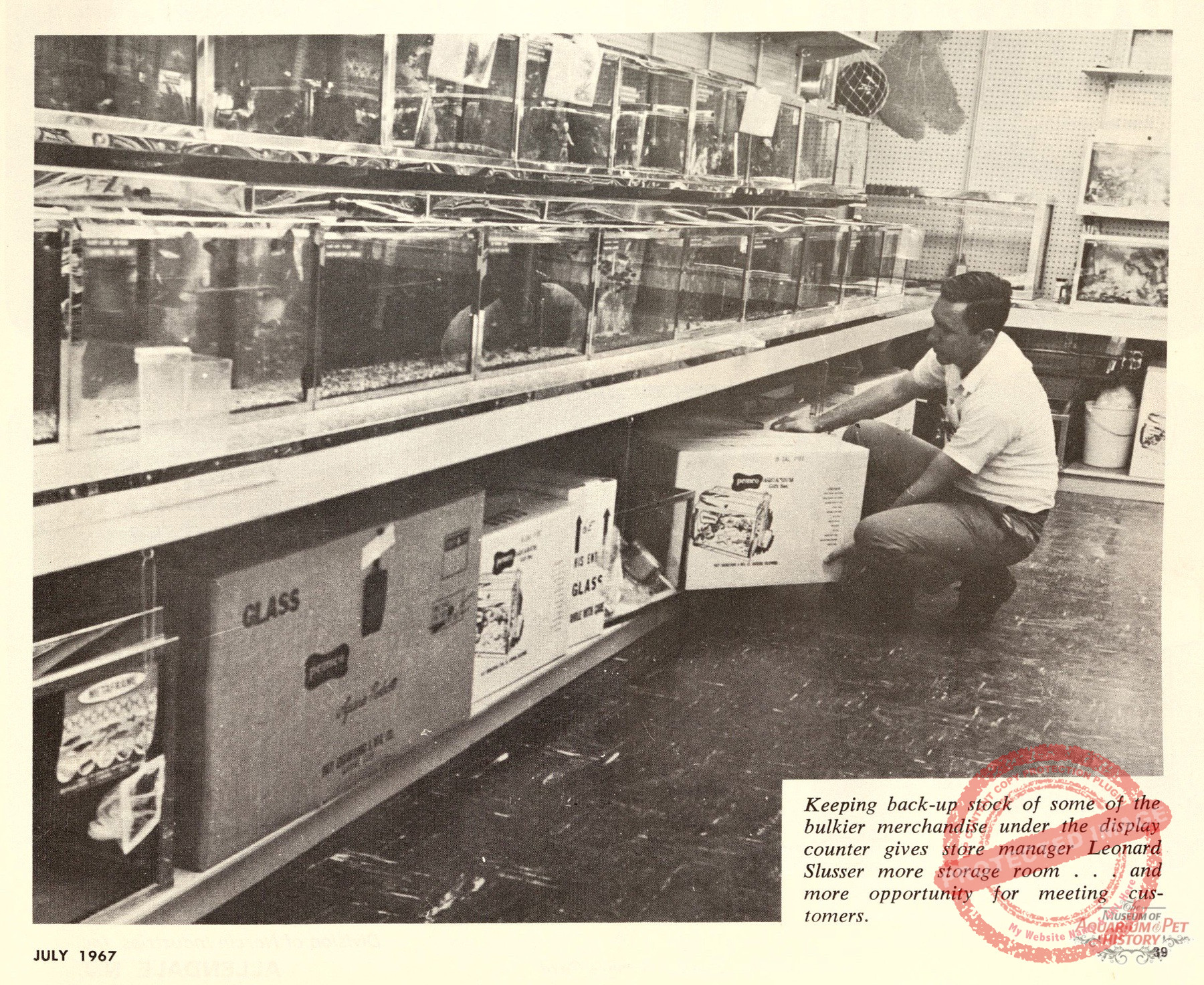 An image from an article in the July 1967 edition of Pet Industry showing Leonard Slusser of Western Garden Center in Salt Lake City, Utah. Leonard has his hands on a PEMCO Aquarium Kit (which I have never seen!). Notice all the aquariums in this fish room are 1960s era PEMCOs!