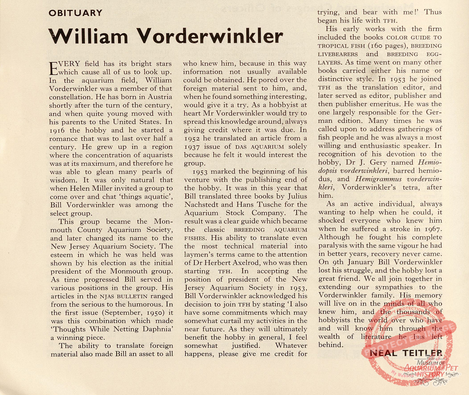 Published in the March 1970 edition of PetFish Monthly. William Vorderwinkler was an aquarium legend who was president of New Jersey Aquarium Society and worked as the translation editor for Dr. Herbert Axelrod’s magazine, Tropical Fish Hobbyist. Several books written by William Vorderwinkler can be found below the obituary.