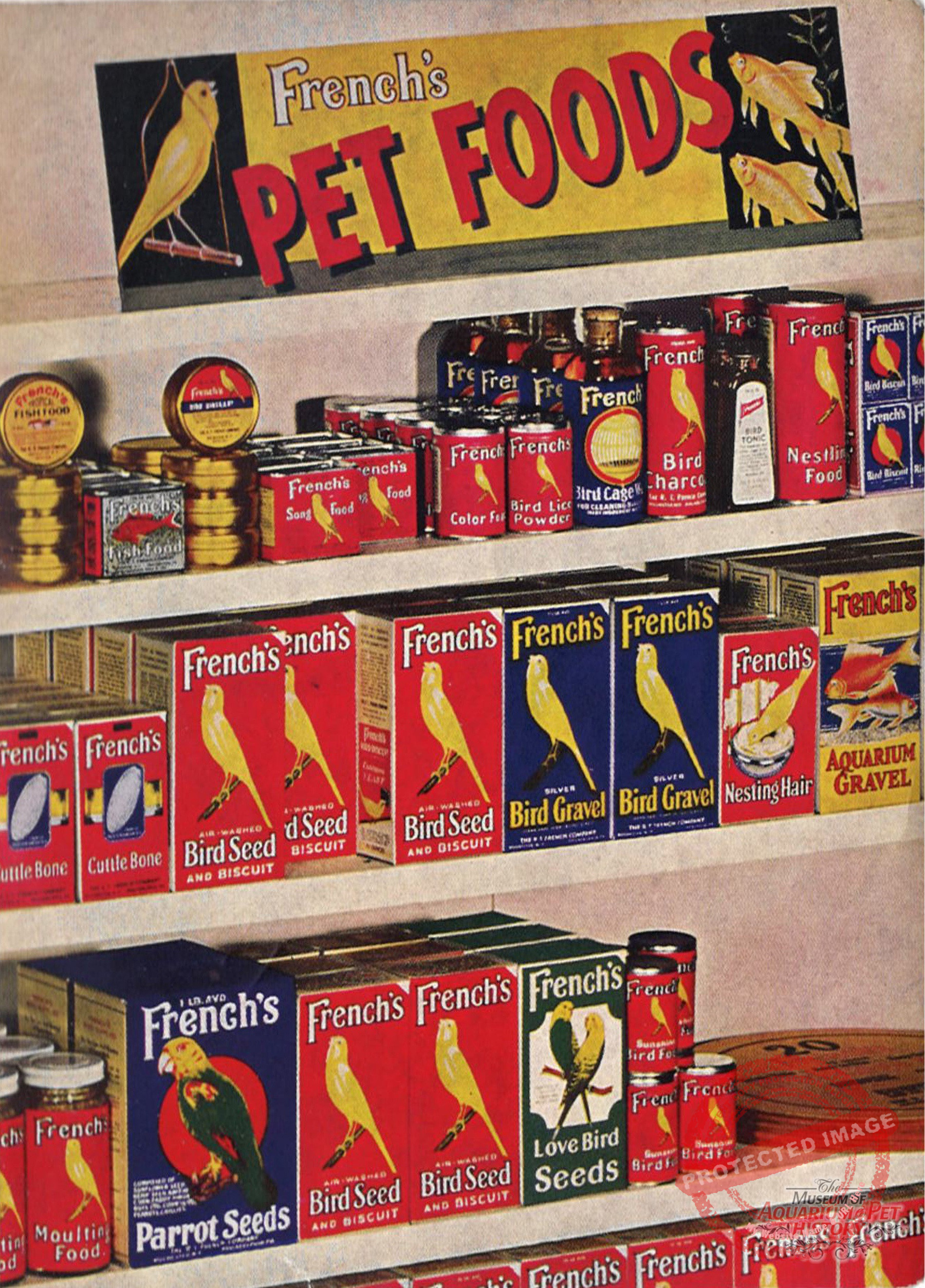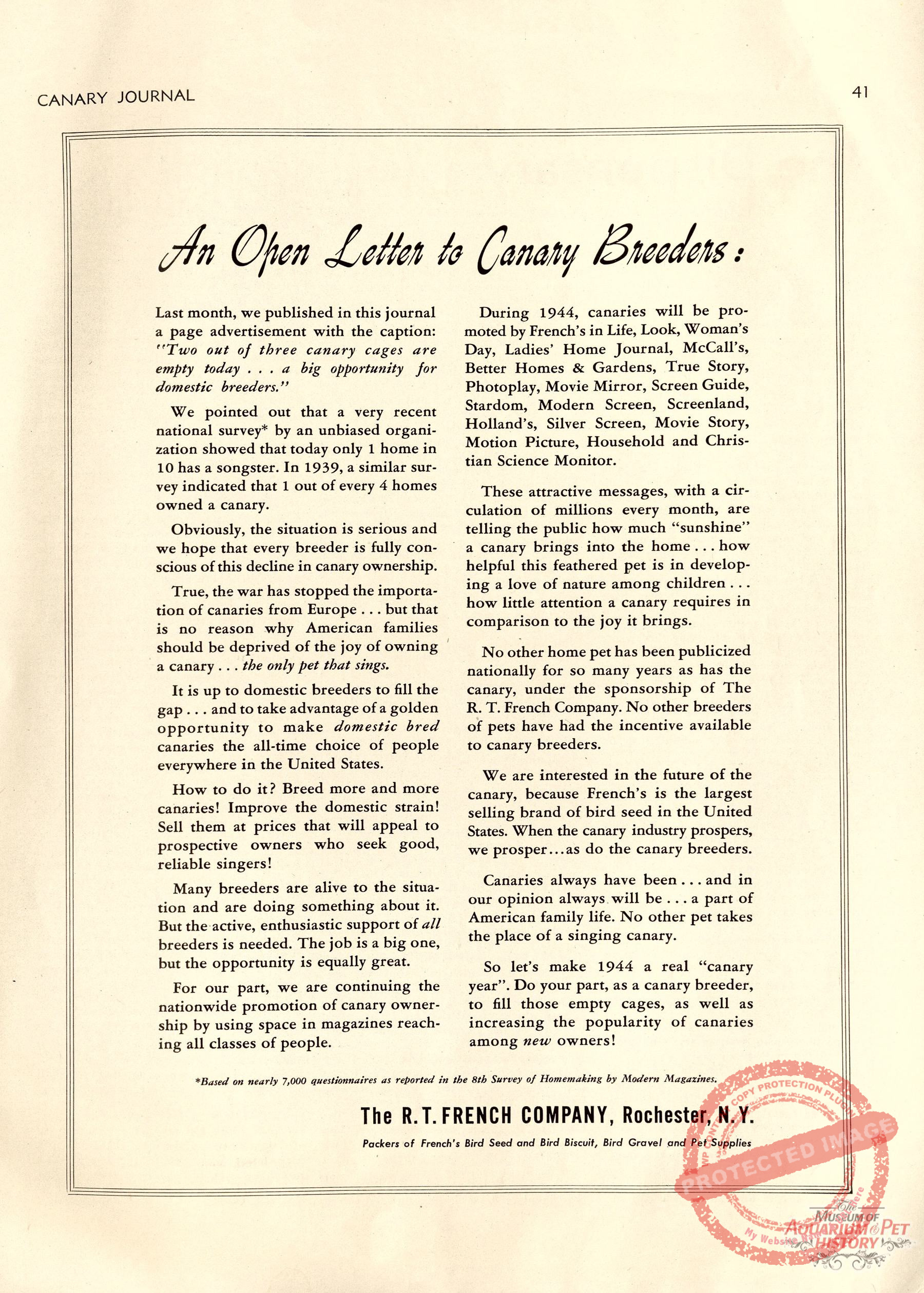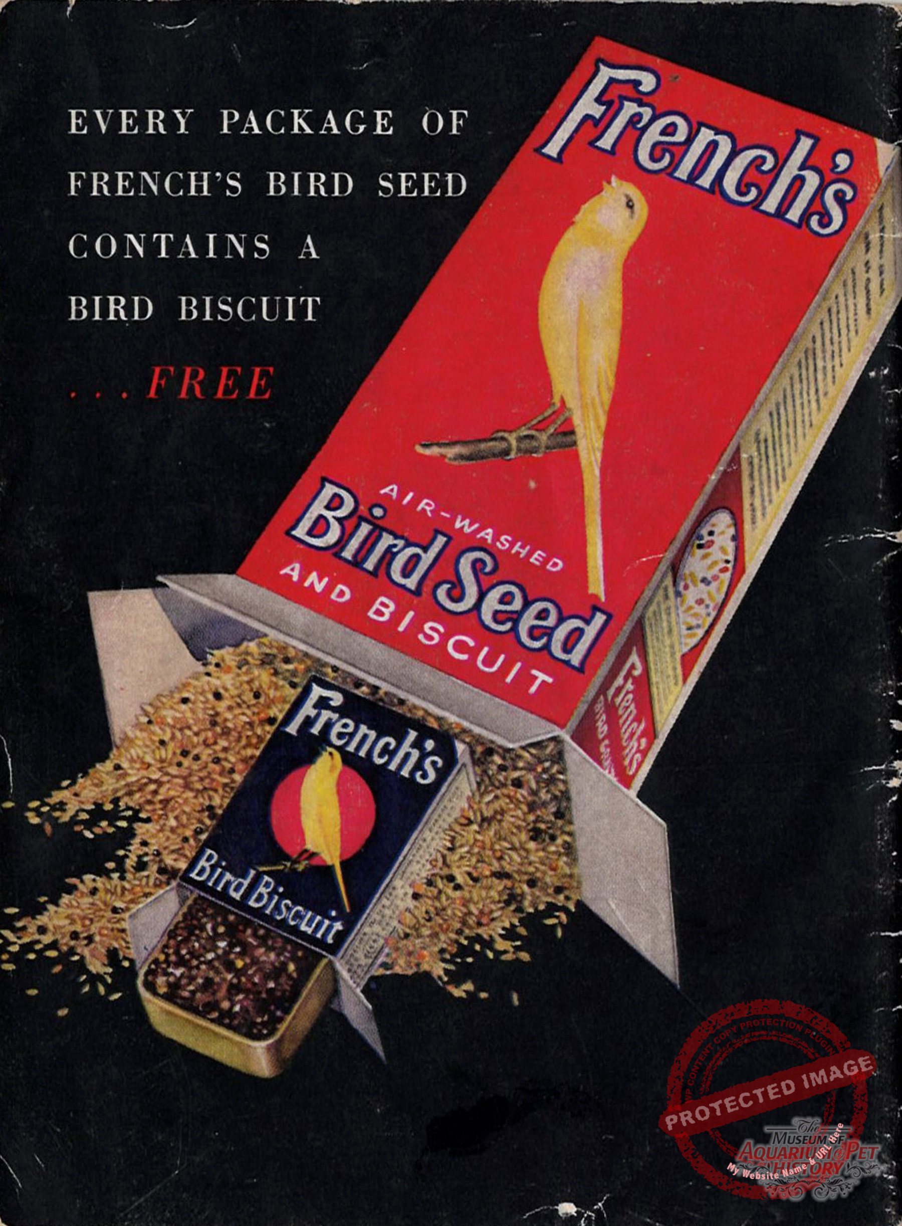 An advertisement from the R.T. French Company (makers of French’s Mustard) during wartime (WWII) asking for people to “breed more canaries” to make up for the gap in imports during the war. The R.T. French Company put a huge effort in marketing canaries, even advertising in 19 national magazines during this time. Sadly, R.T. French eventually discontinued all their canary product line by the year 1950.