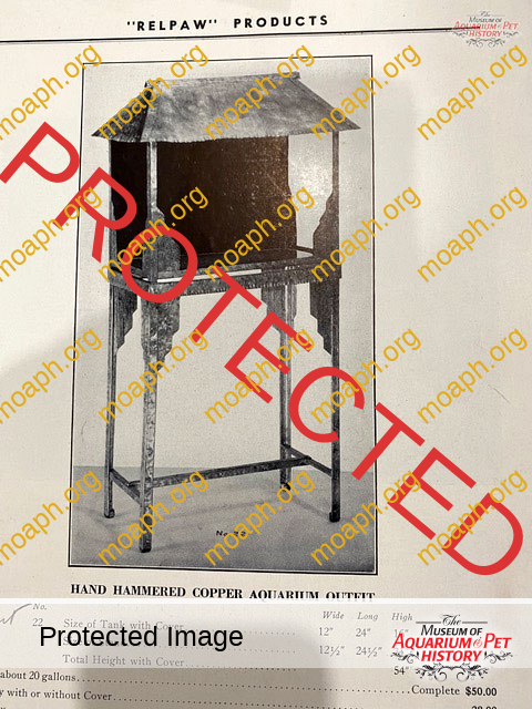 The Museum of Aquarium and Pet History is offered many historical pet artifacts from time to time. Some we purchase and some we don’t. (And some are donated to the museum). When we first saw this hand-hammered copper aquarium we thought it was a “one-off” made by a hobbyist maybe in the 1940 or 1950s. We decided to pass on this tank but then while doing some research on aquarium ornaments in a 1920s Relpaw aquarium catalog low and behold we found this aquarium on the first catalog page!! Turns out it was made in small production numbers by hand and imported from Germany in the 1920s by the Nicholas Wapler company under his trade name “Relpaw” (his last name spelled backward). This was a happy accident!
