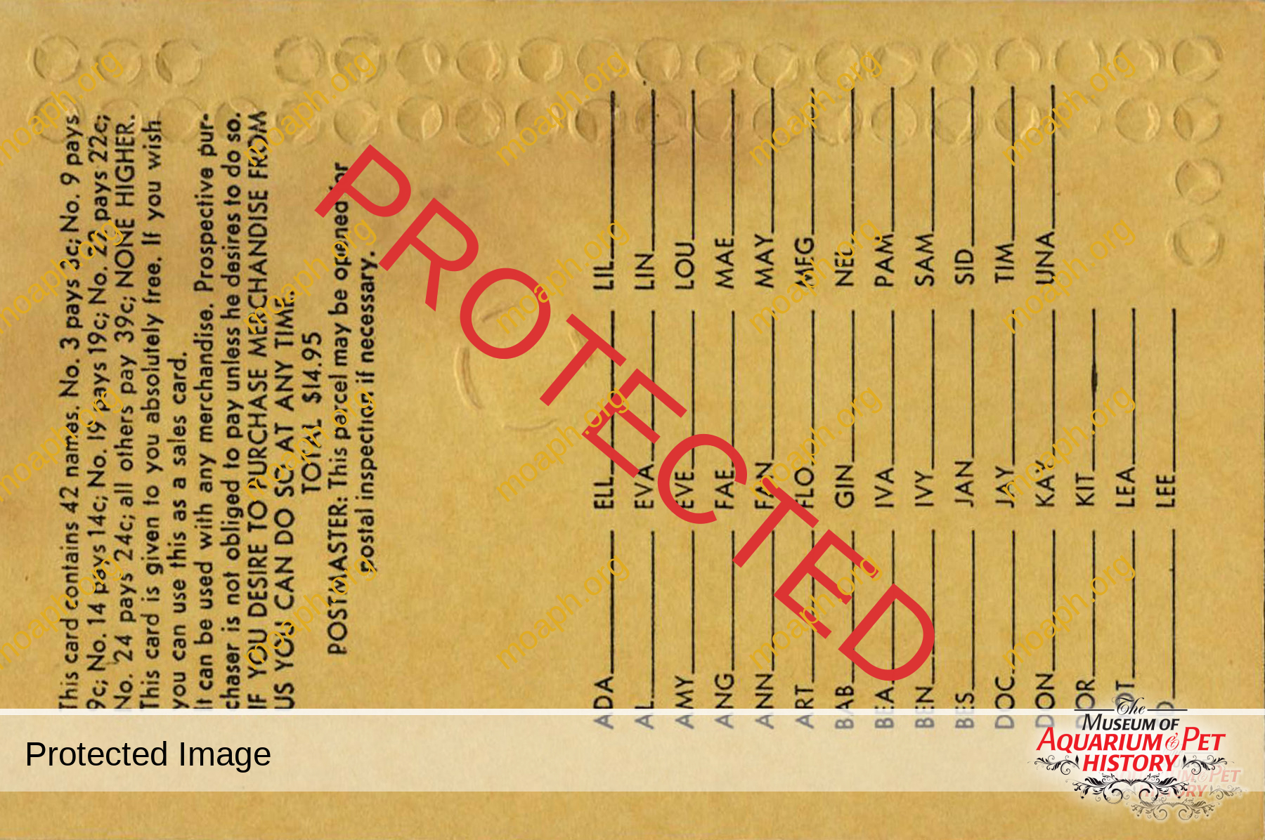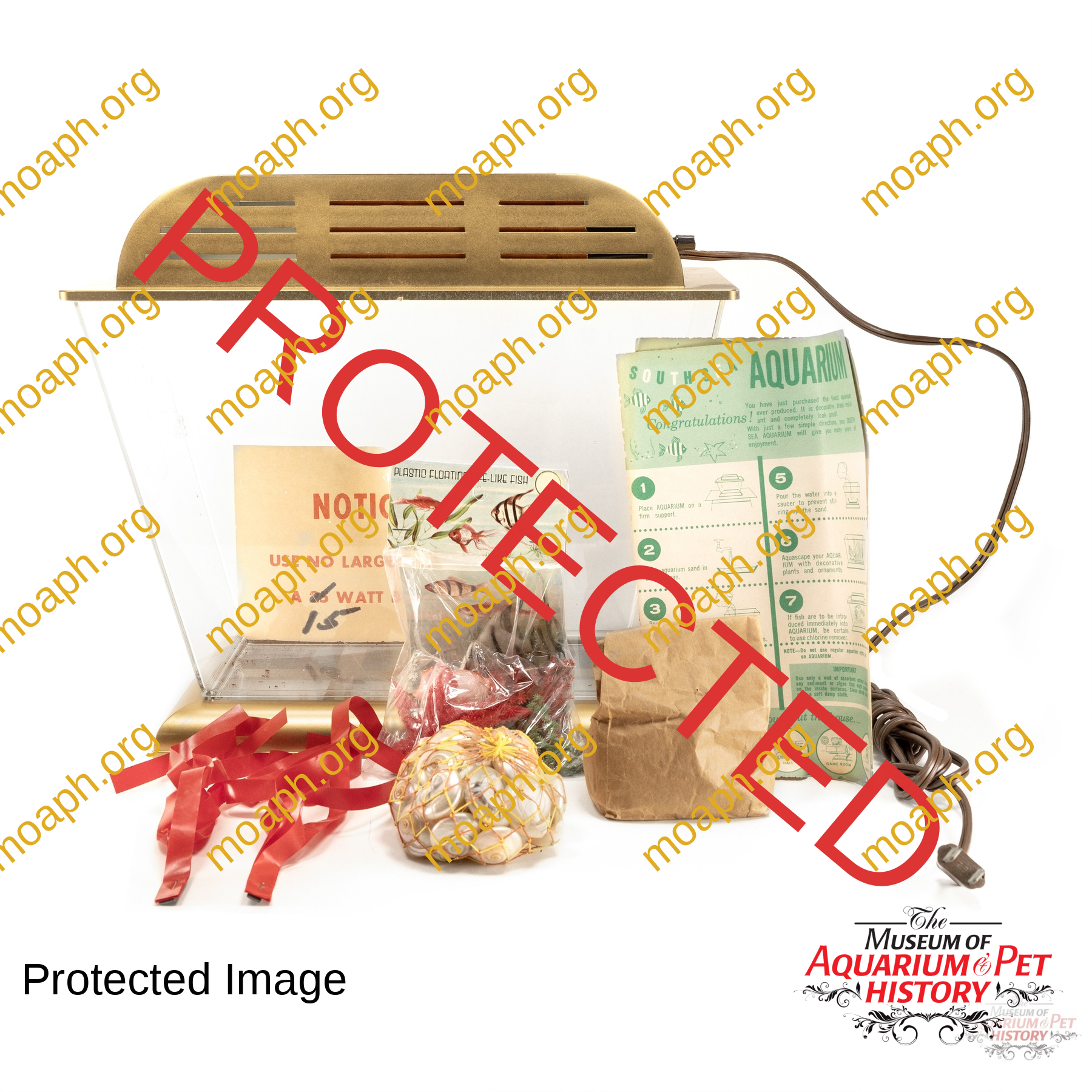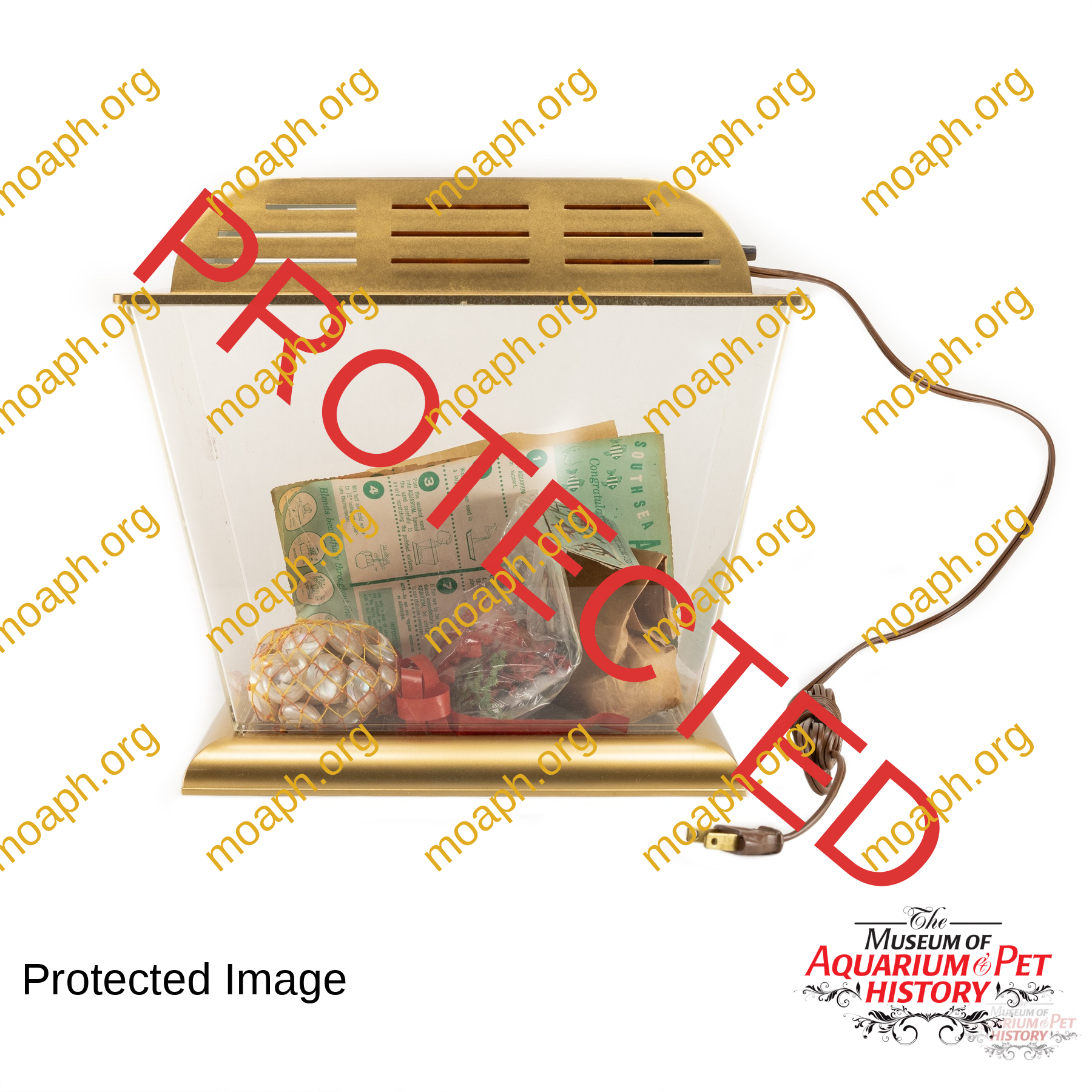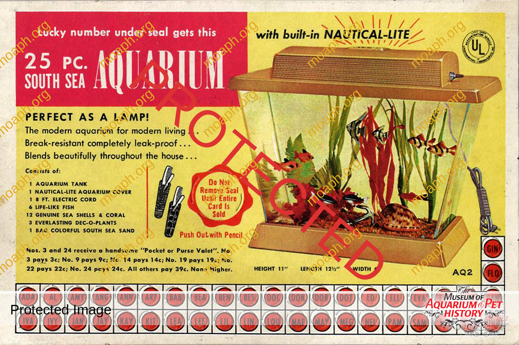 One of the earliest “plastic” aquariums that was used as a promotional give-away. This modern design led to Will-Ness and Metaframe making similar larger-sized plastic aquariums in the same shape. Also, Pemco and Metaframe made an angular metal-frame aquarium in this shape as well.