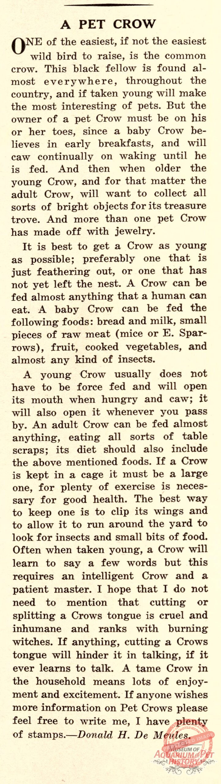 A Pet Crow Printable Version of Article I always wanted a pet crow as a kid. This is an interesting short article on keeping them in captivity circa 1940s. From the June 1943 edition of All-Pets Magazine.