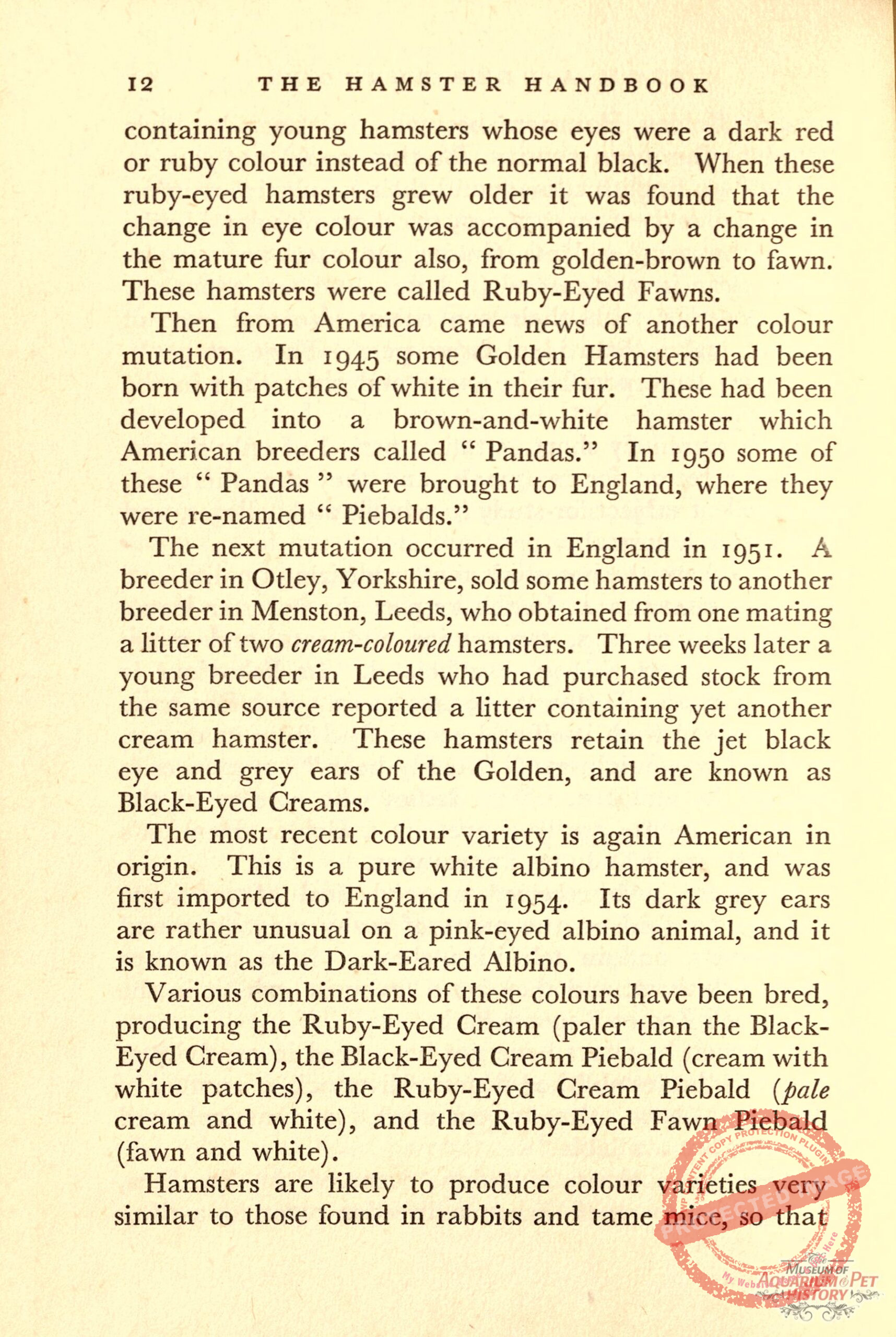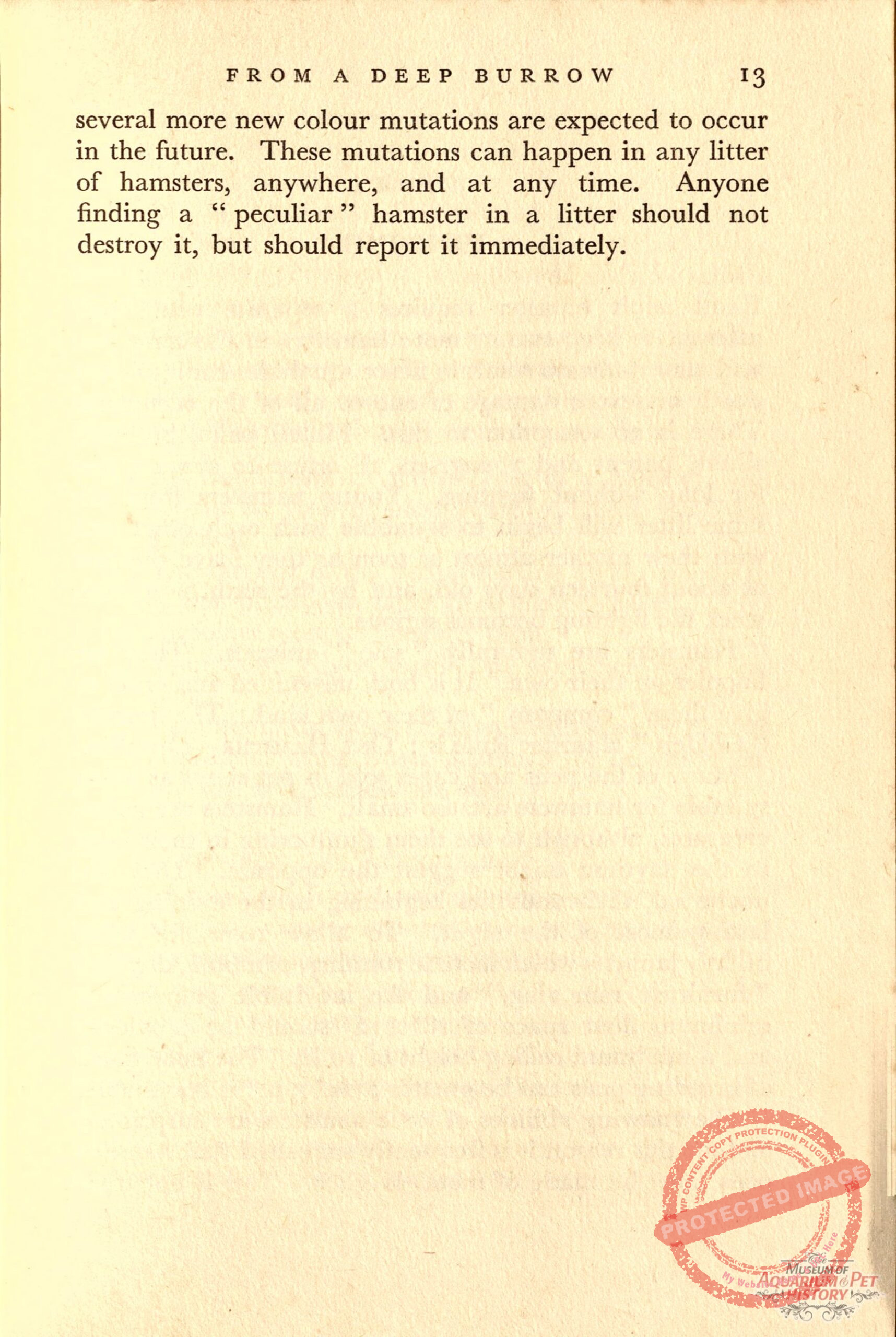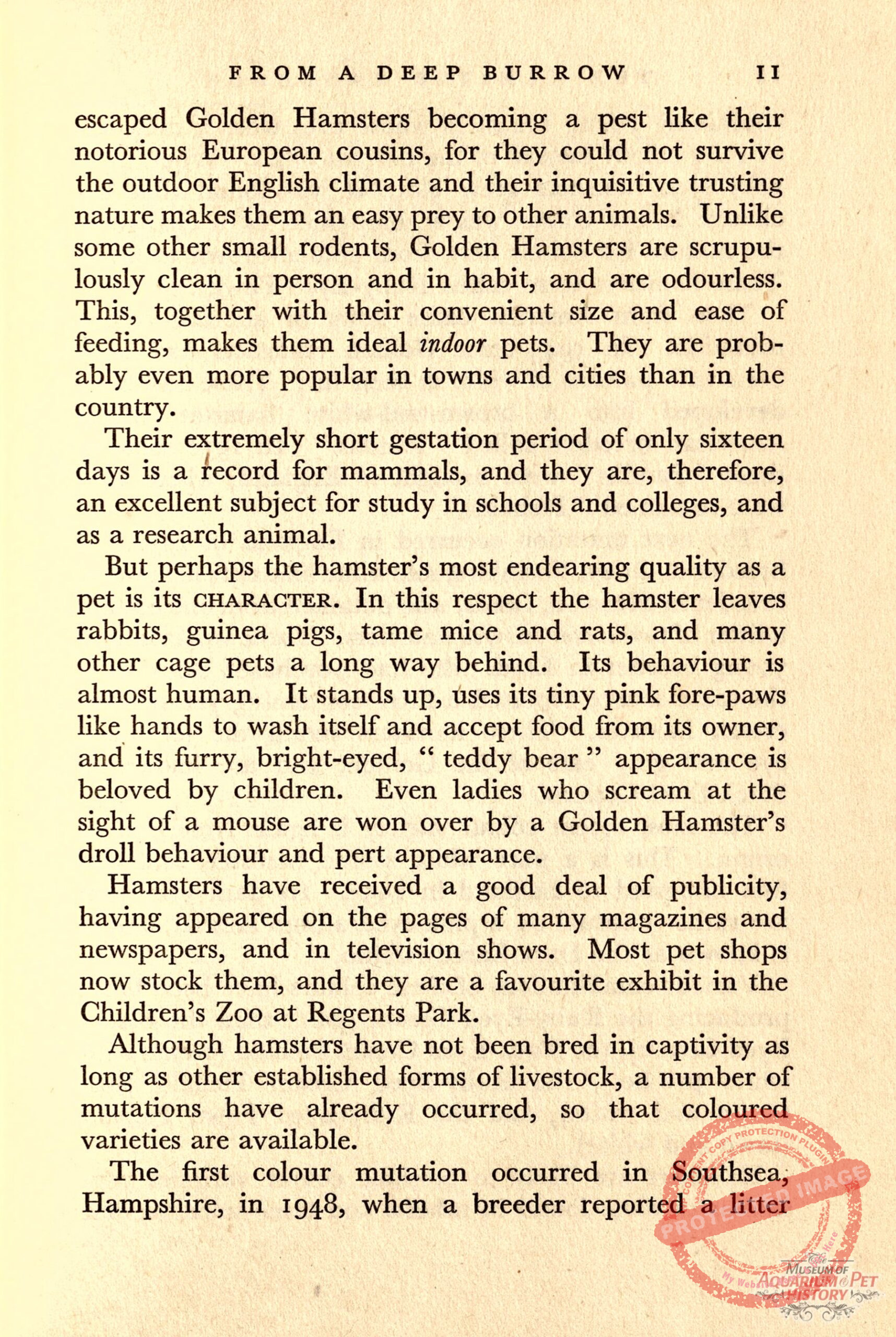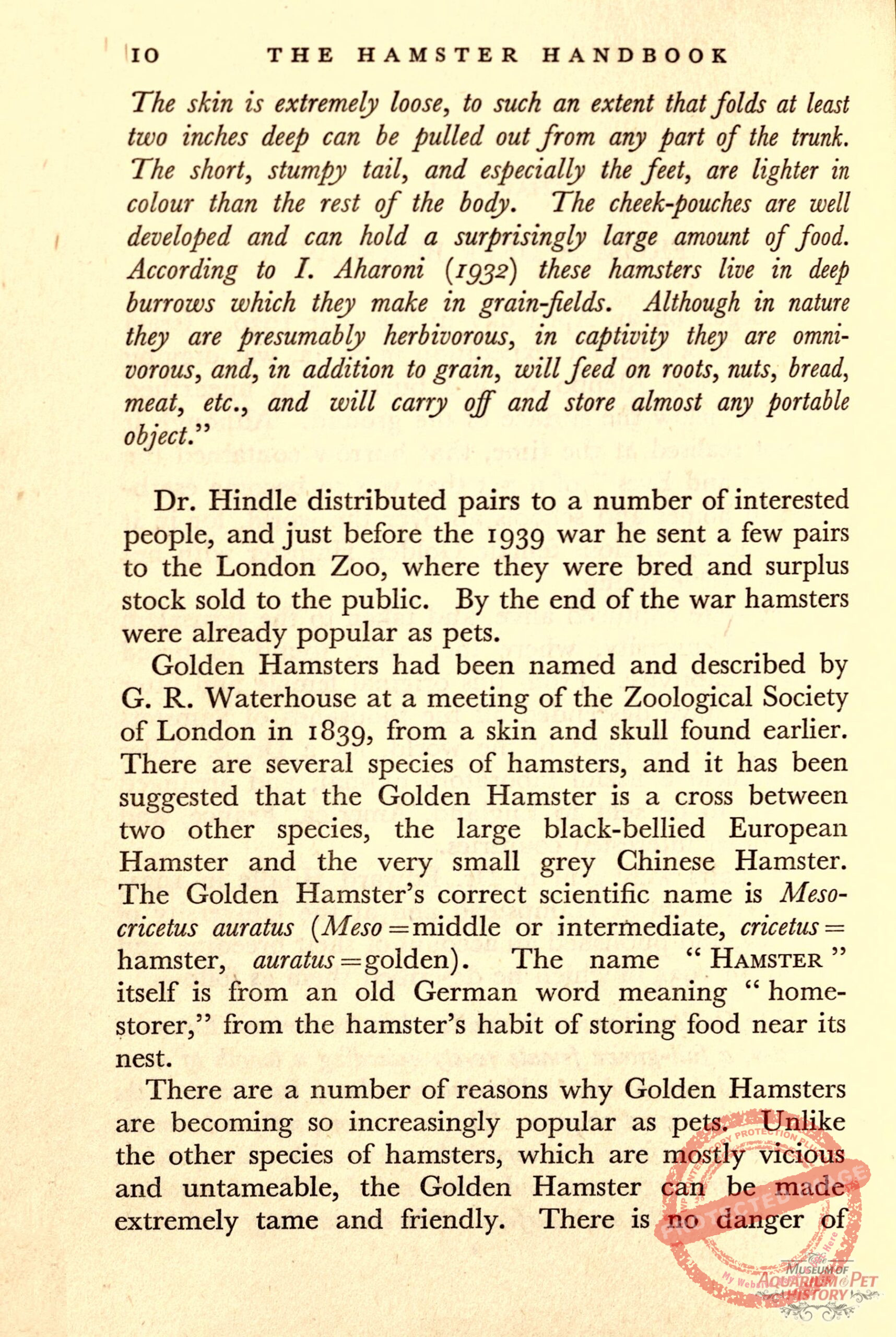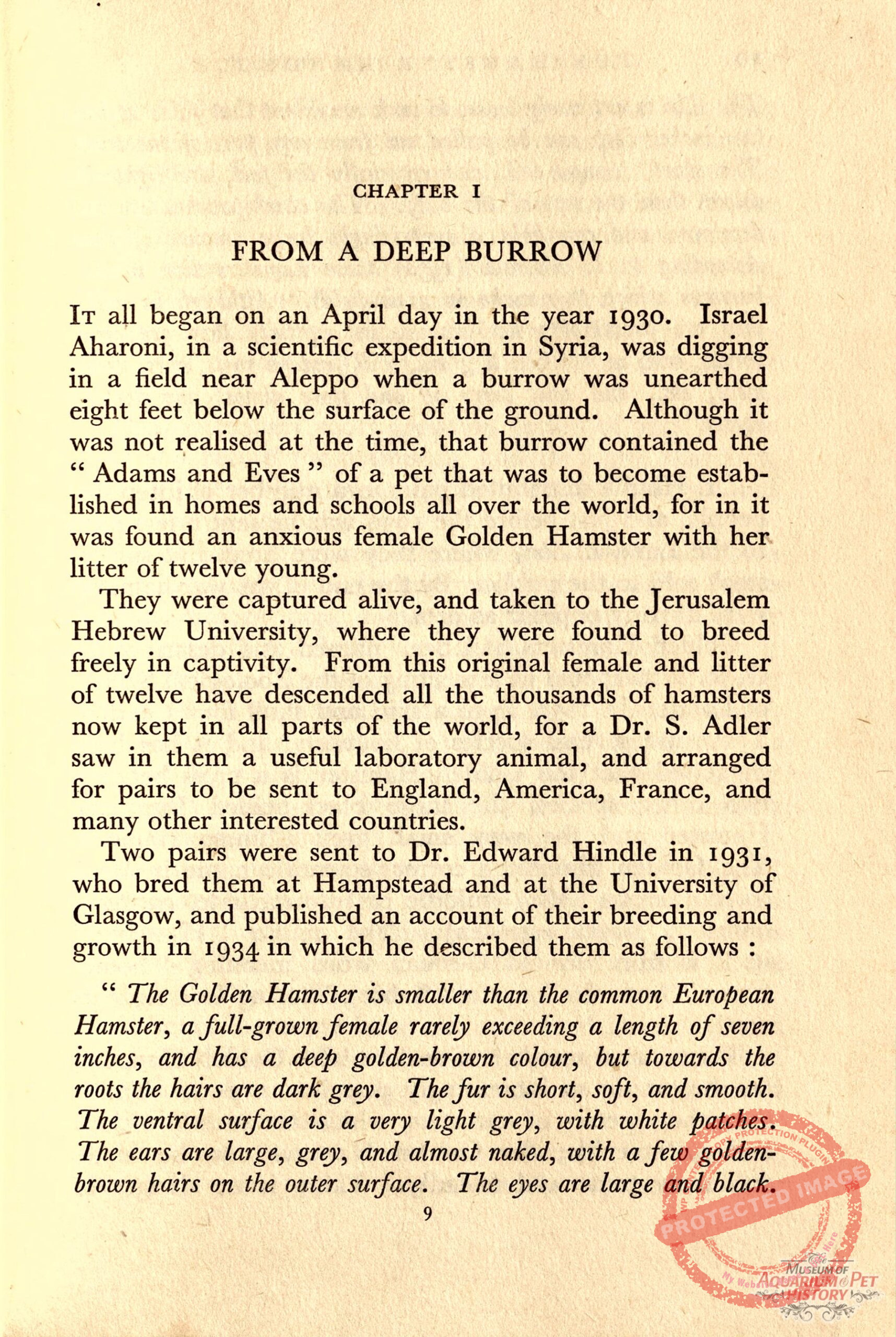 From a Deep Burrow (history of the first hamsters in captivity). Originally published in The Hamster Handbook by H. Deaton and T.W. Pond in 1956.