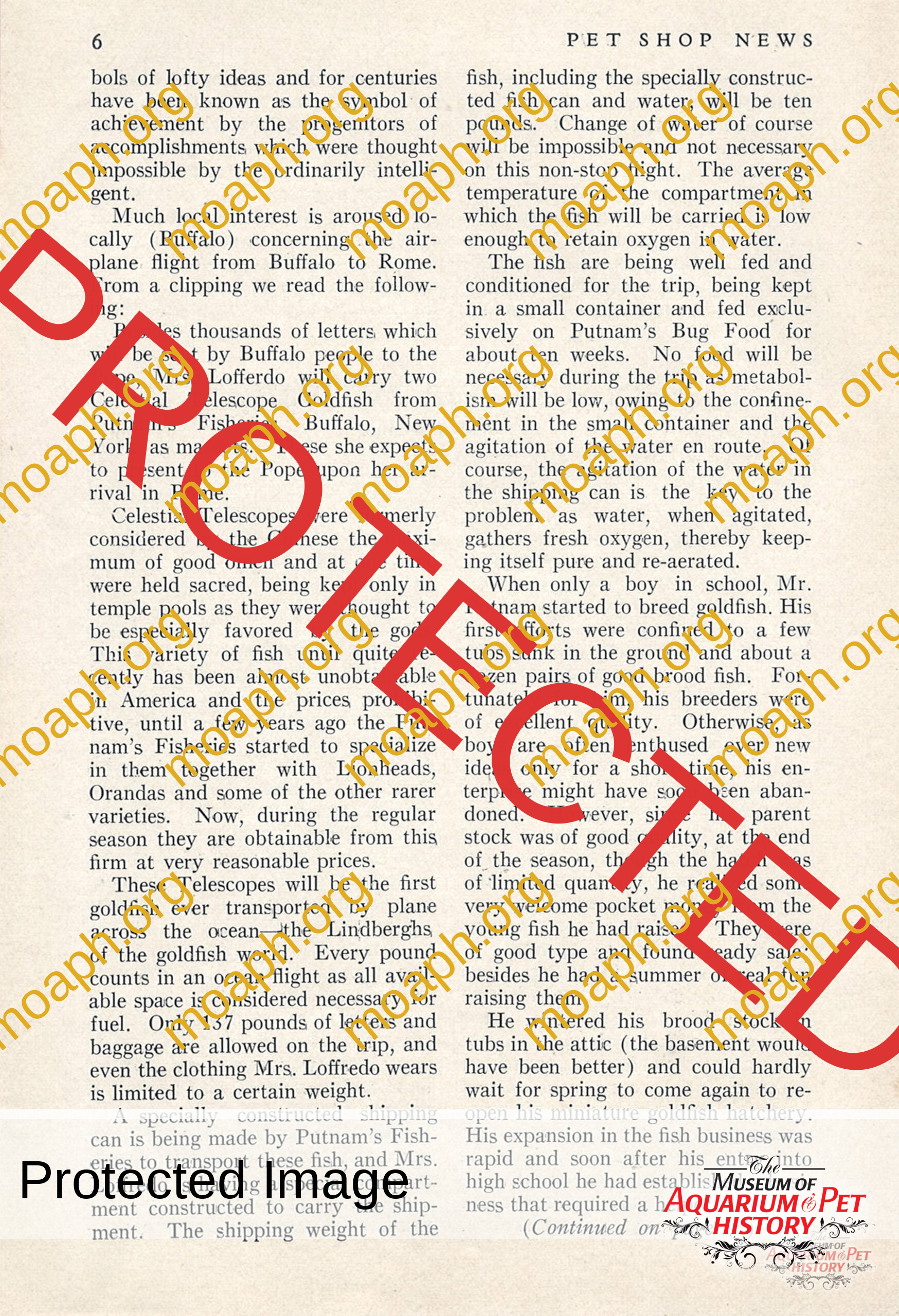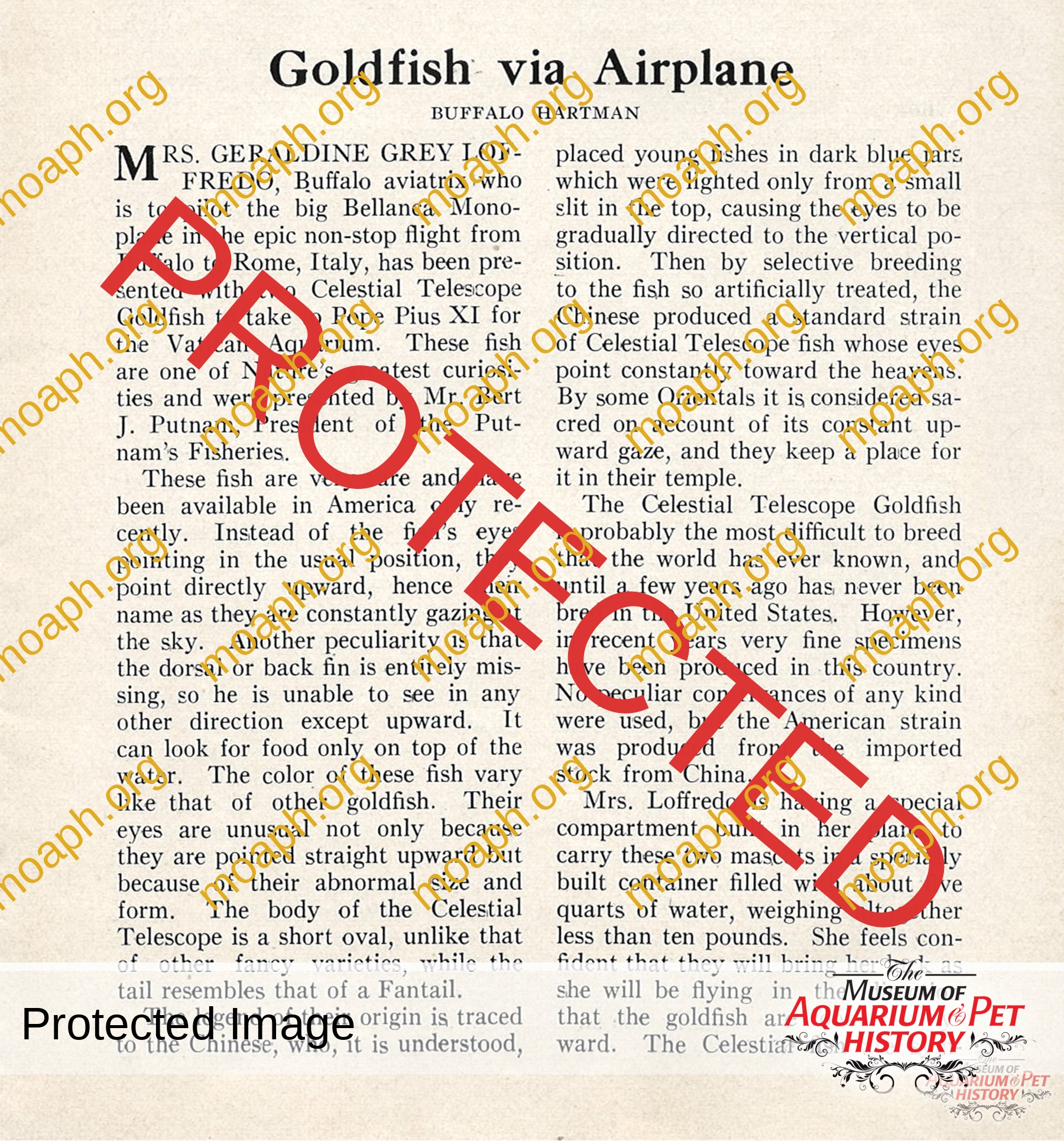 This interesting article is on an early shipment of goldfish from Buffalo, New York, to Rome, Italy. These rare Celestial Goldfish from Putnam’s Fisheries were bound for Pope Pius XI for the Vatican Aquarium! I wonder if the Vatican in Rome still has an aquarium?