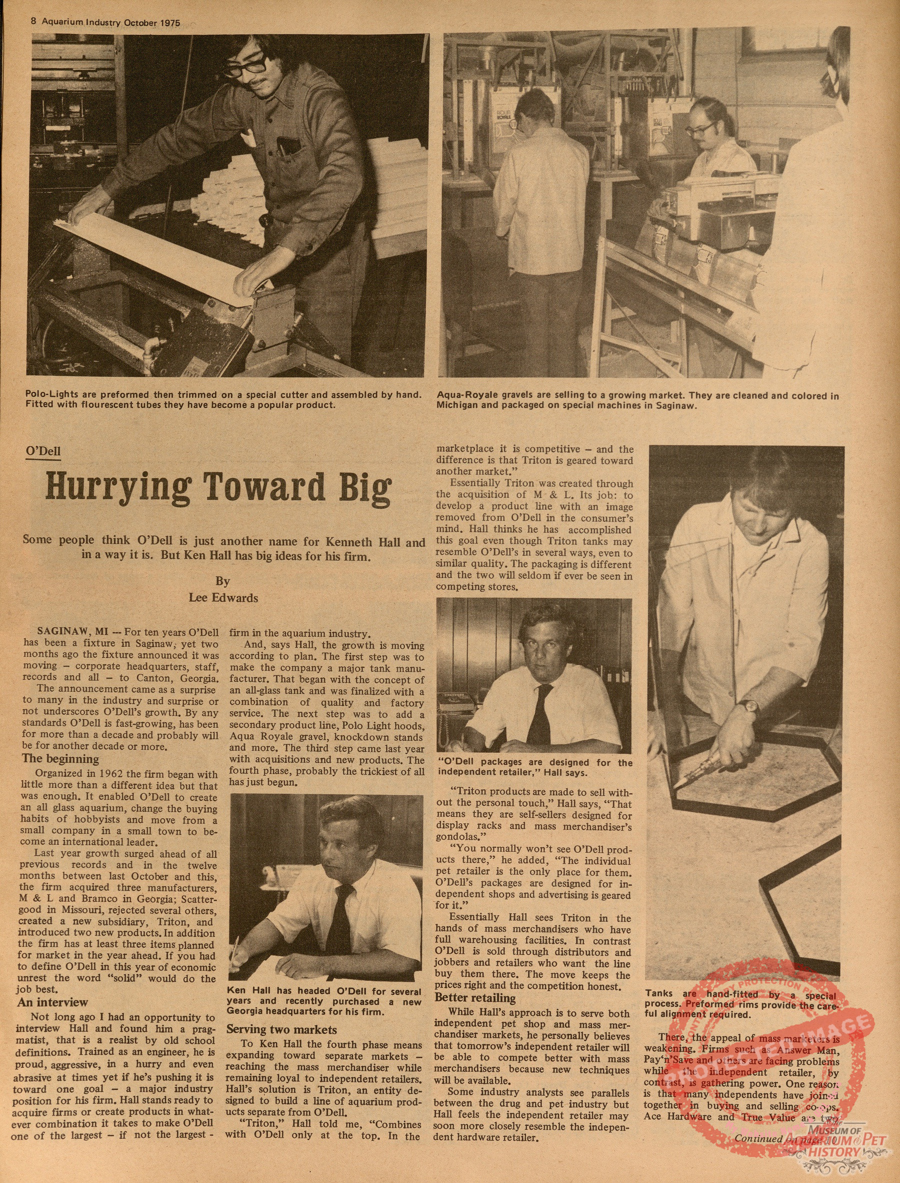 Hurrying Toward Big – Early History of O’Dell by Lee Edwards Printable Version of Article An early history of O’Dell Industries, an early manufacturer of All-Glass aquariums after the invention of silicone rubber. From the October 1975 edition of Aquarium Industry.