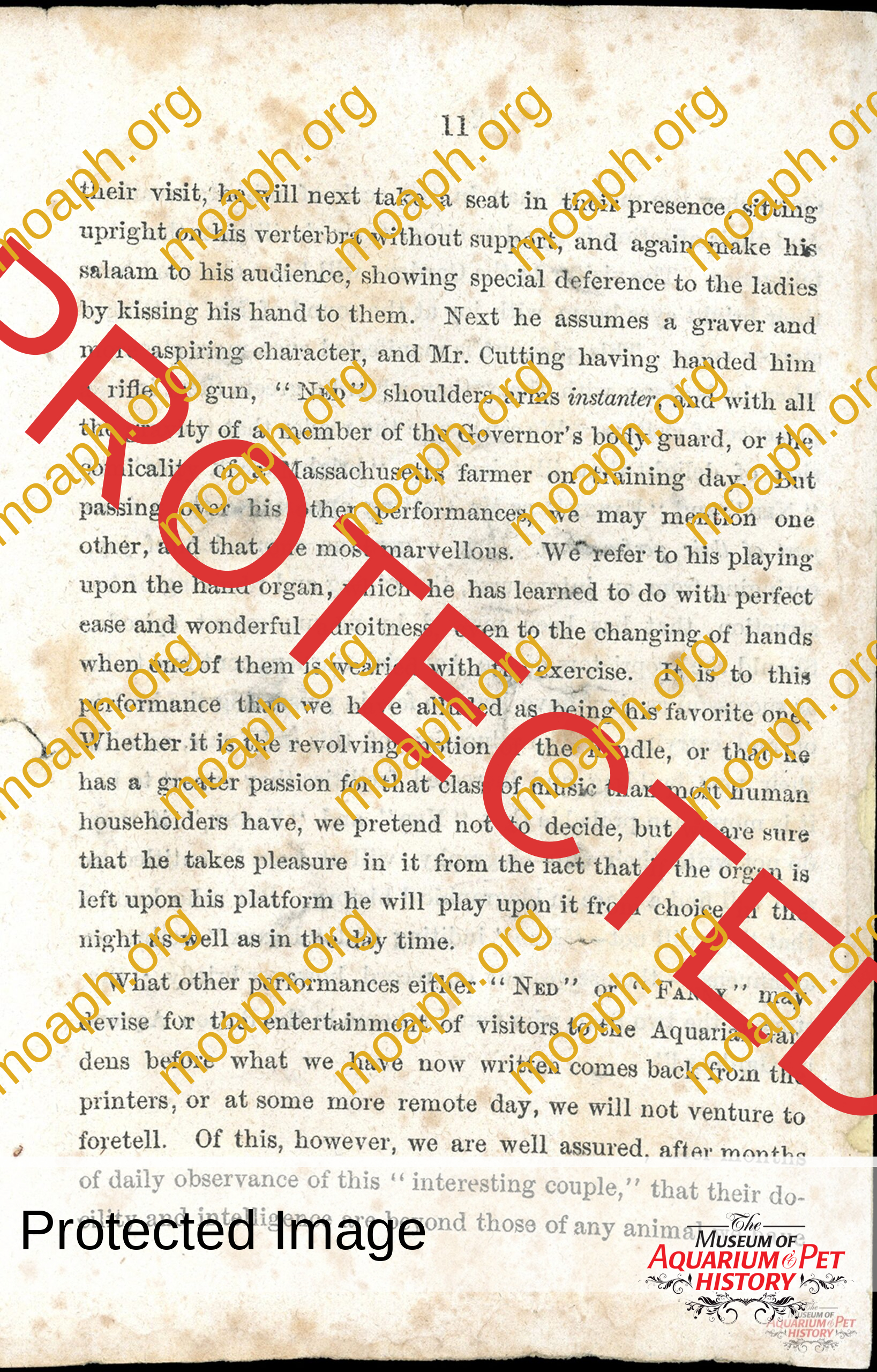 Booklet from 1860 sharing the stories of Ned and Fanny the seals who learned several tricks at the Boston Aquarial Gardens.
