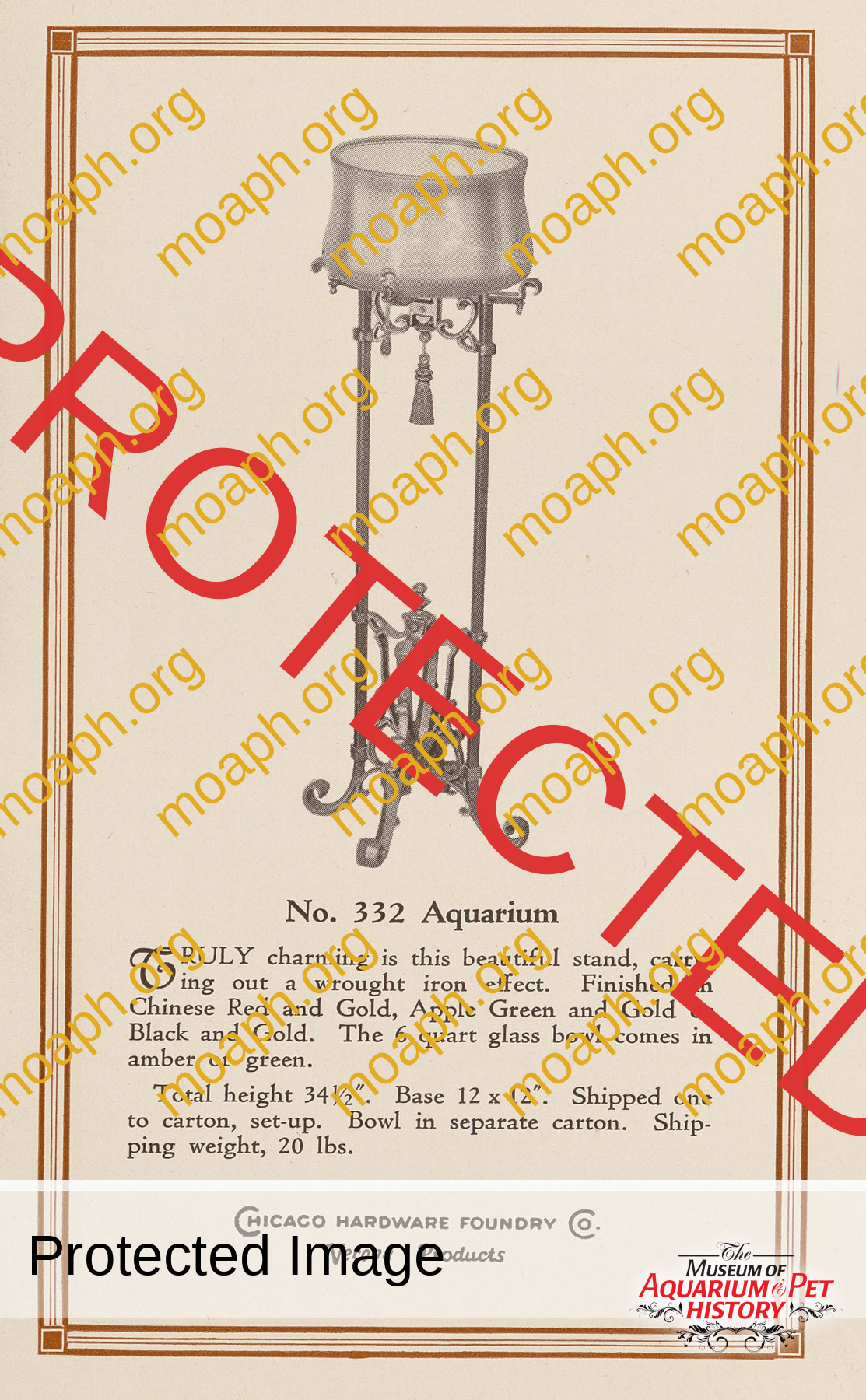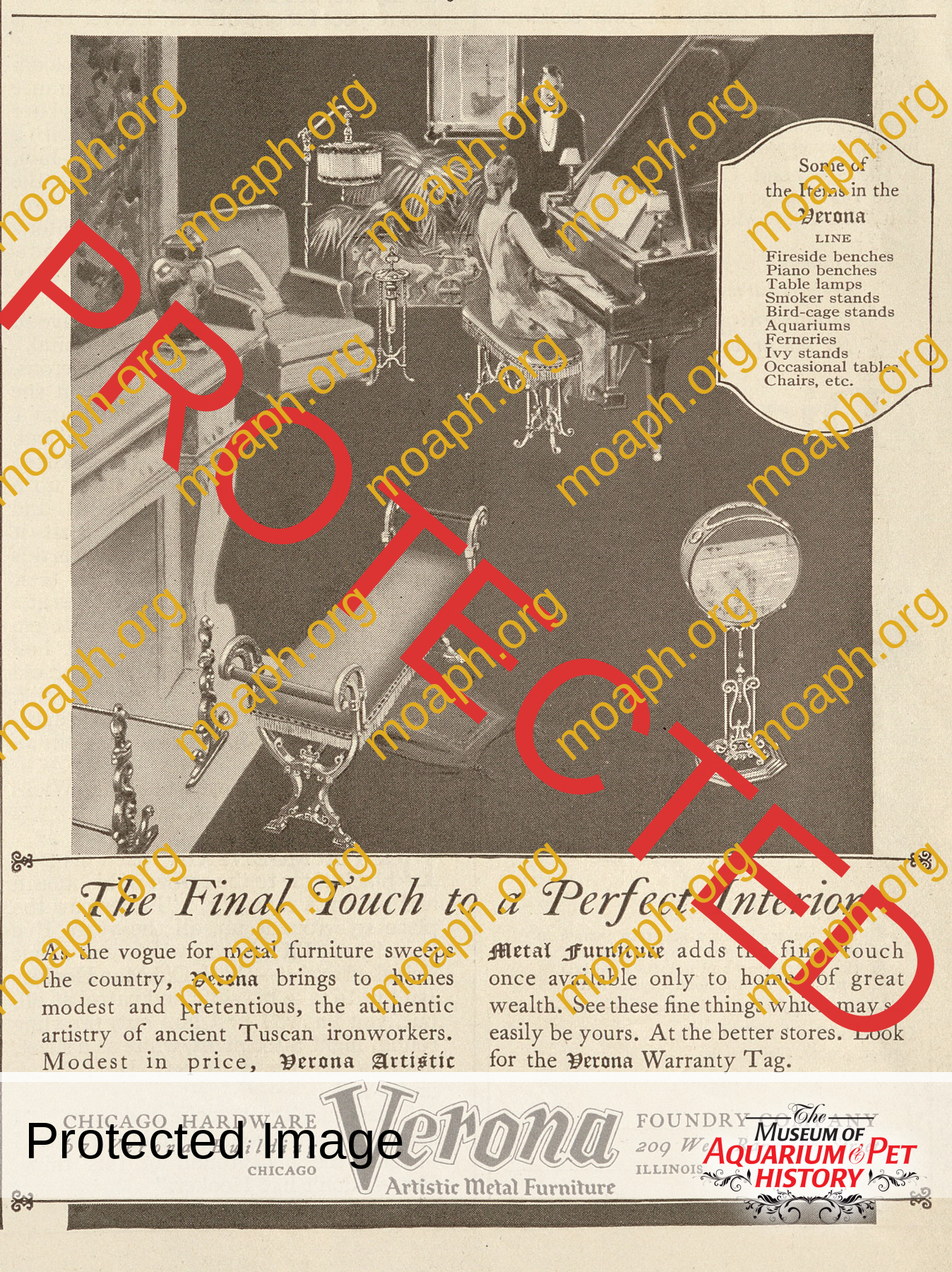 “Verona” (Chicago Hardware Foundry Company) catalog page and advertisement showing late 1920s fishbowl and stand.