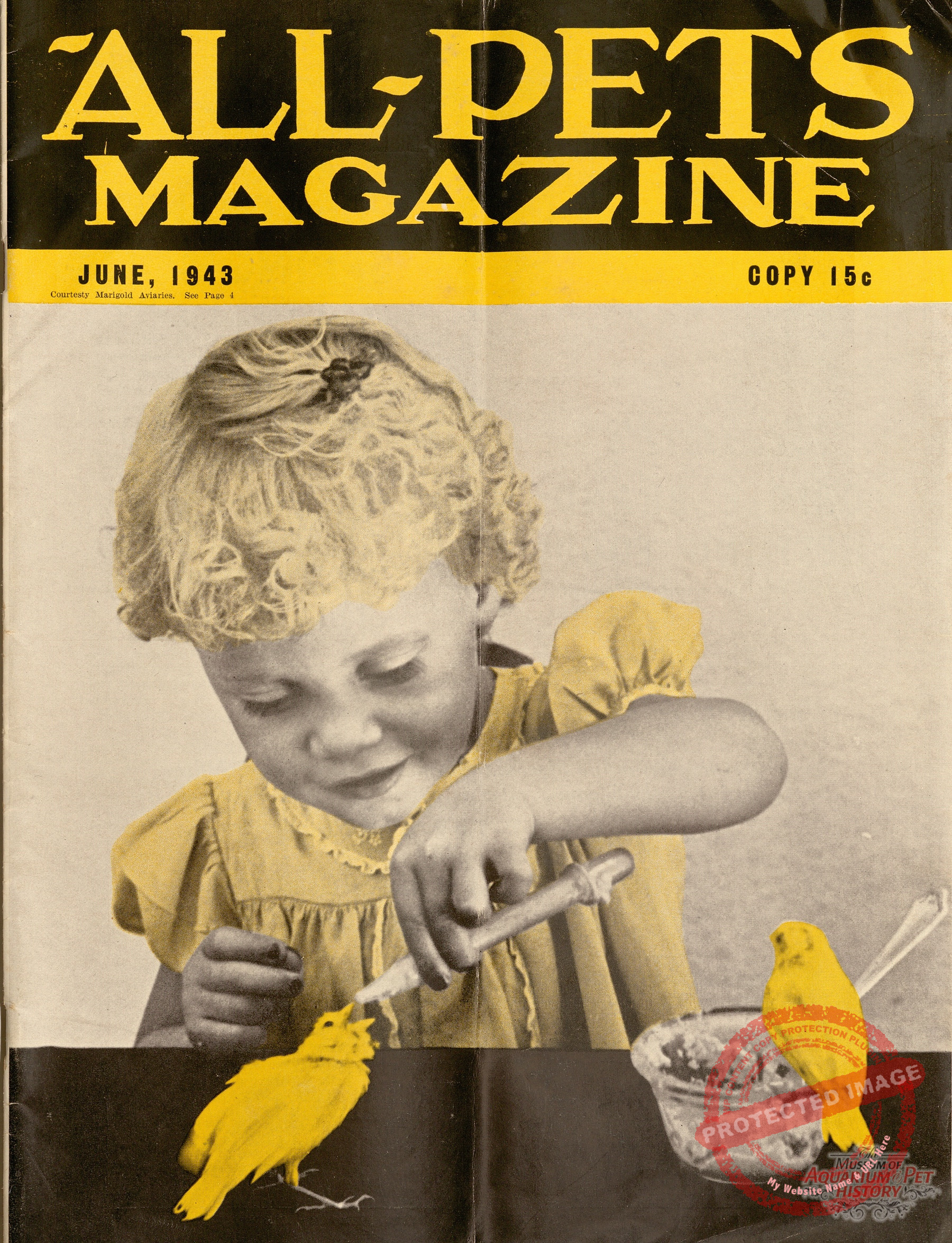 Cute image of a young child hand-feeding a baby canary. From the cover of the June 1943 edition of All-Pets Magazine.