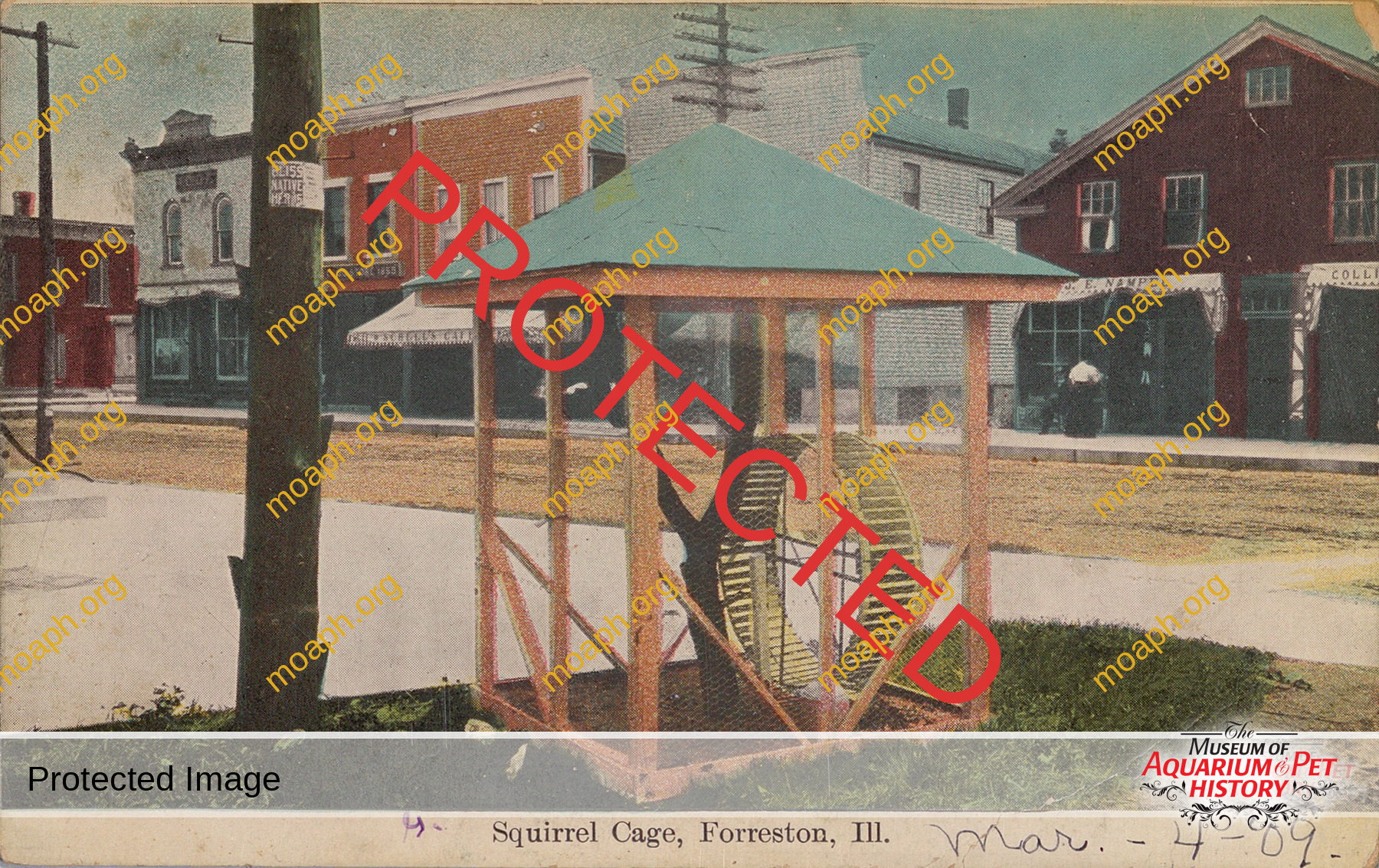 In 1909, Forreston, Illinois, erected a giant “squirrel cage” in the center of town. We are not sure if this was the town’s “pet squirrel” who lived in this cage or a nuisance squirrel. In any case, check out the giant exercise wheel in this cage. Plus, the town printed a postcard to celebrate this unusual squirrel cage.