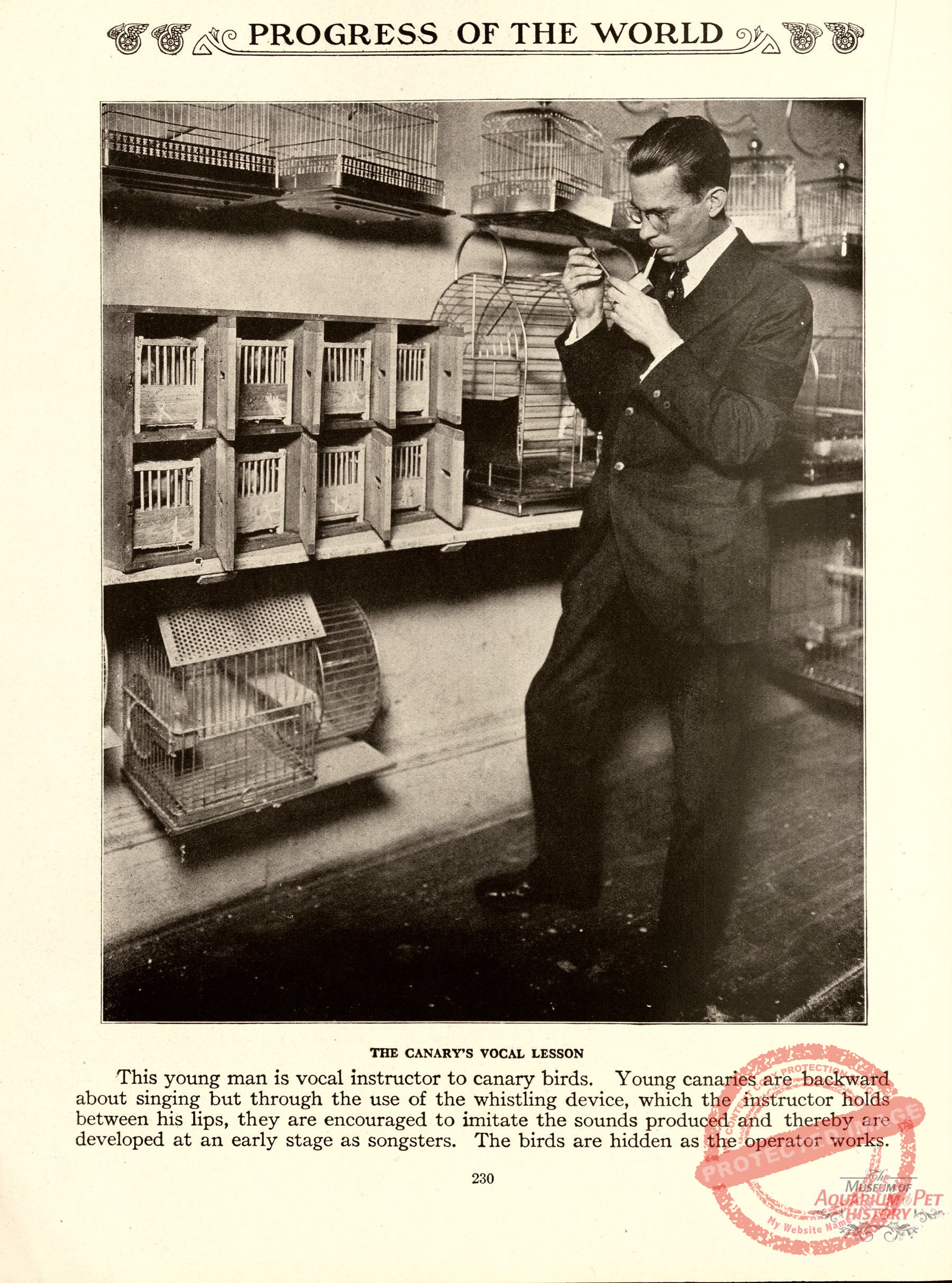 An amazing image taken from the 1910 Progress of the World booklet series. Shows a canary instructor teaching his canaries how to sing with a special whistling device. Notice the squirrel cage on the bottom shelf!