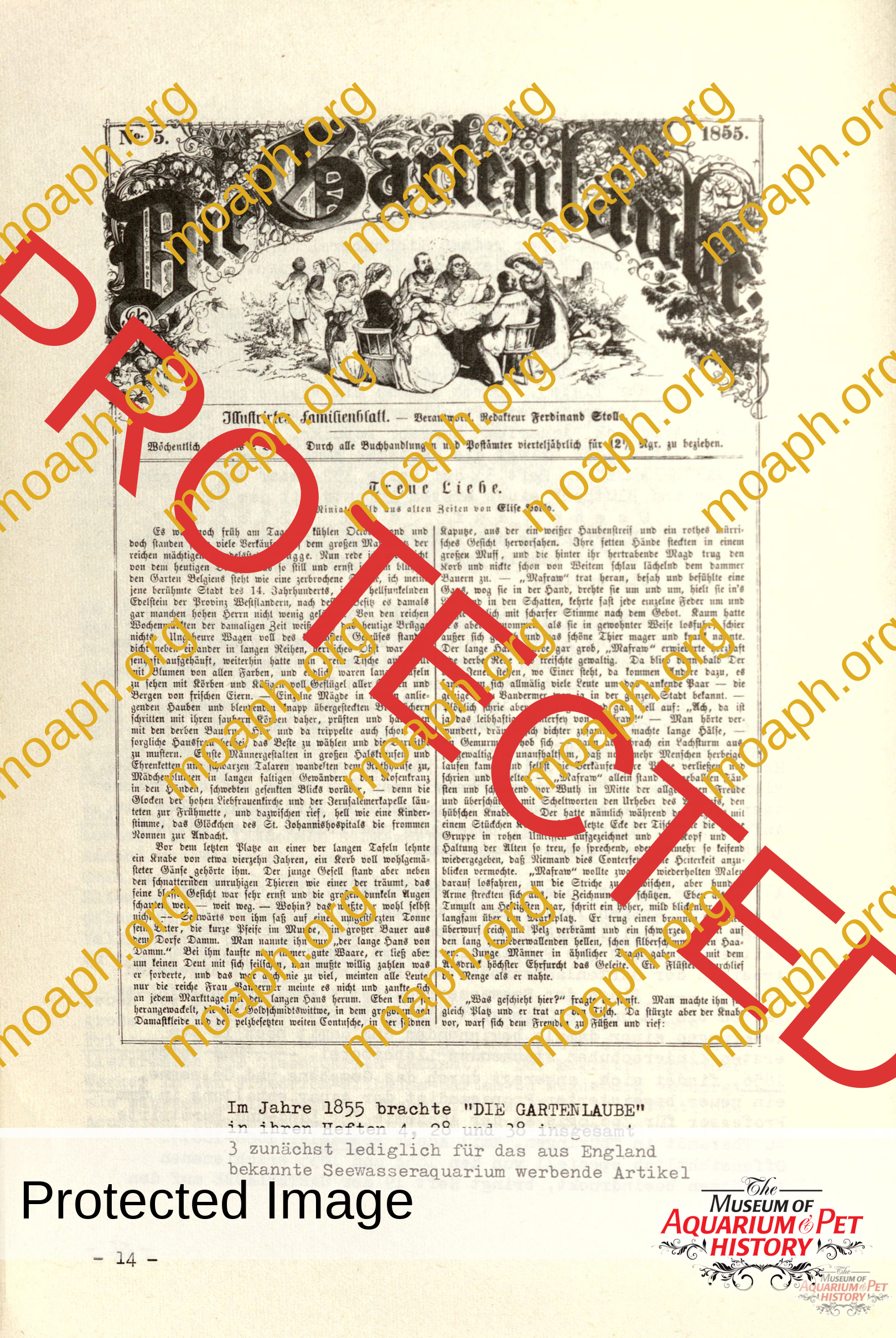 In 1855, the Gartenlaube published a total of 3 articles in its issues 4, 28 and 38, initially only advertising the seawater aquarium, which was well known in England.