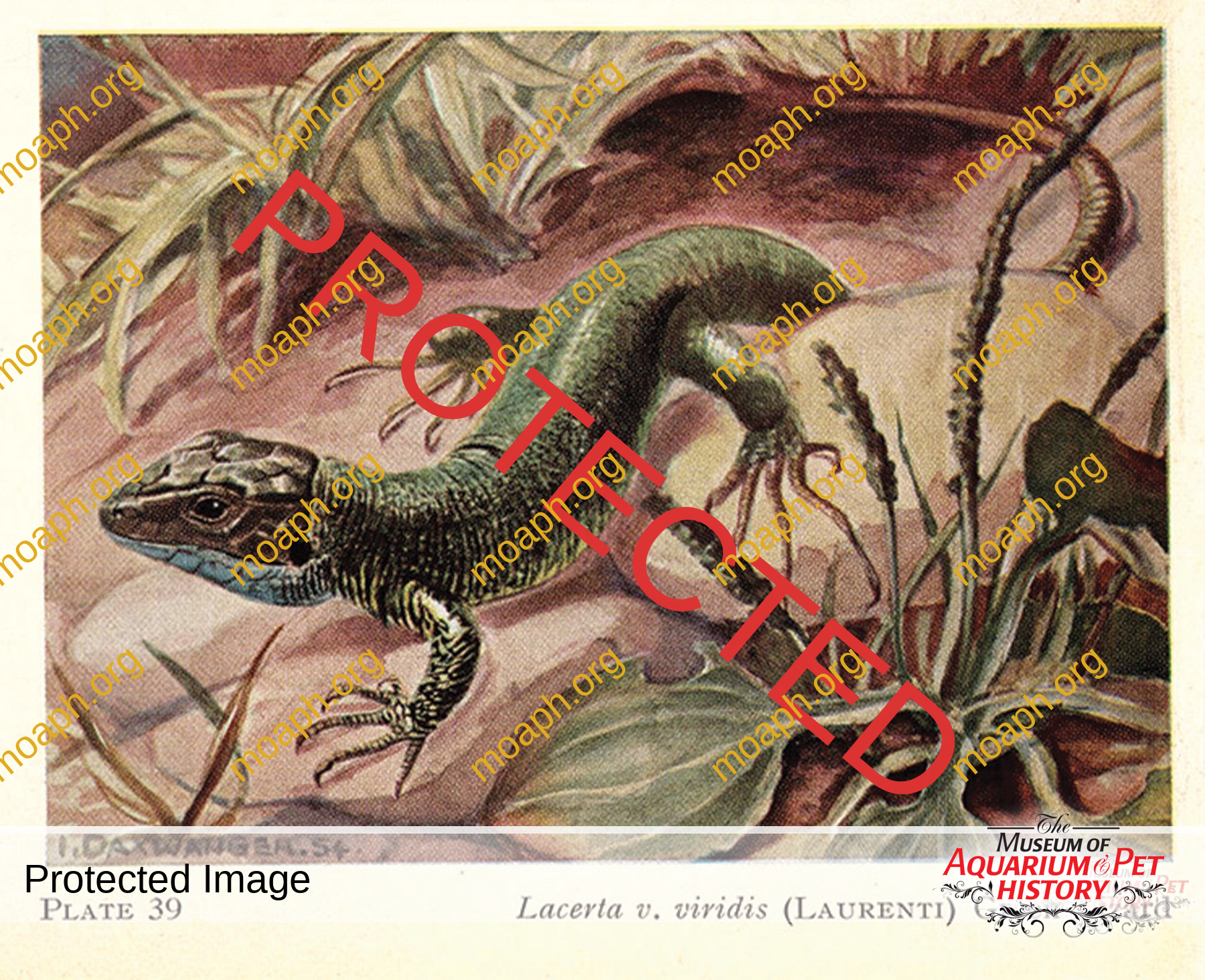 Lacerta v. viridis (green lizard) from Reptiles and Amphibians of Europe, written by Walter Hellmich, and illustrated by Irmgard Daxwanger.