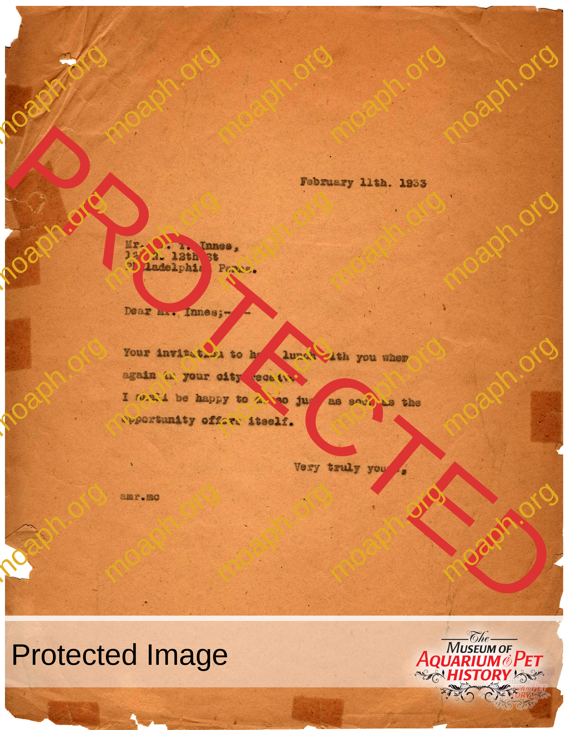 The Museum of Aquarium and Pet History has a collection of original letters from William T. Innes dating back to 1914. By reproducing one Innes letter per month, we hope we can give our patrons a personal glimpse of Innes the aquarist, publisher, friend, father, and American icon to the aquarium field.