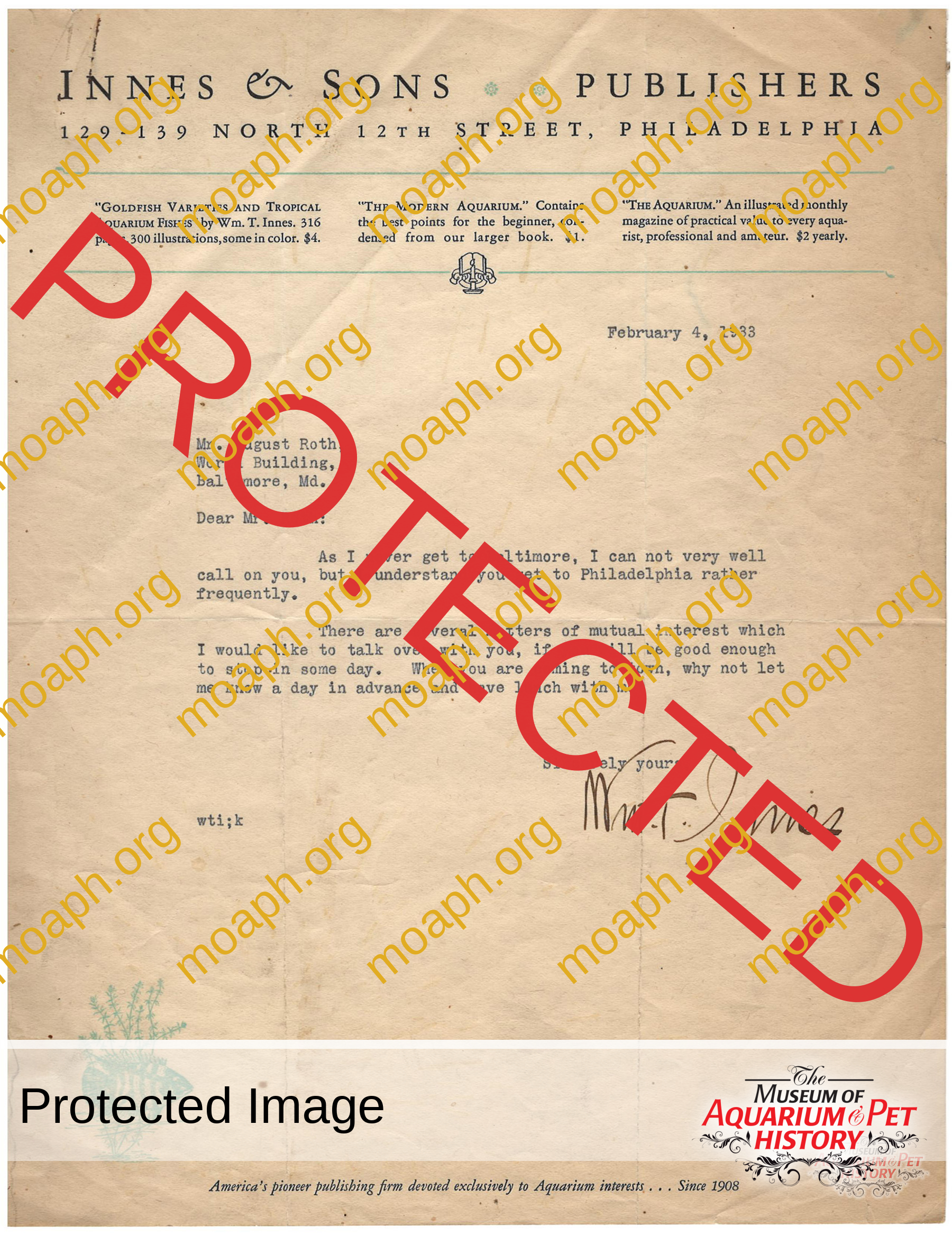 The following Innes letter from 1933. Innes responding to Auggie Roth, publisher of Aquatic Life Magazine, in reply to having lunch with him to discuss items of mutual benefit. (I would love to have been a fly on the wall in this meeting!)
