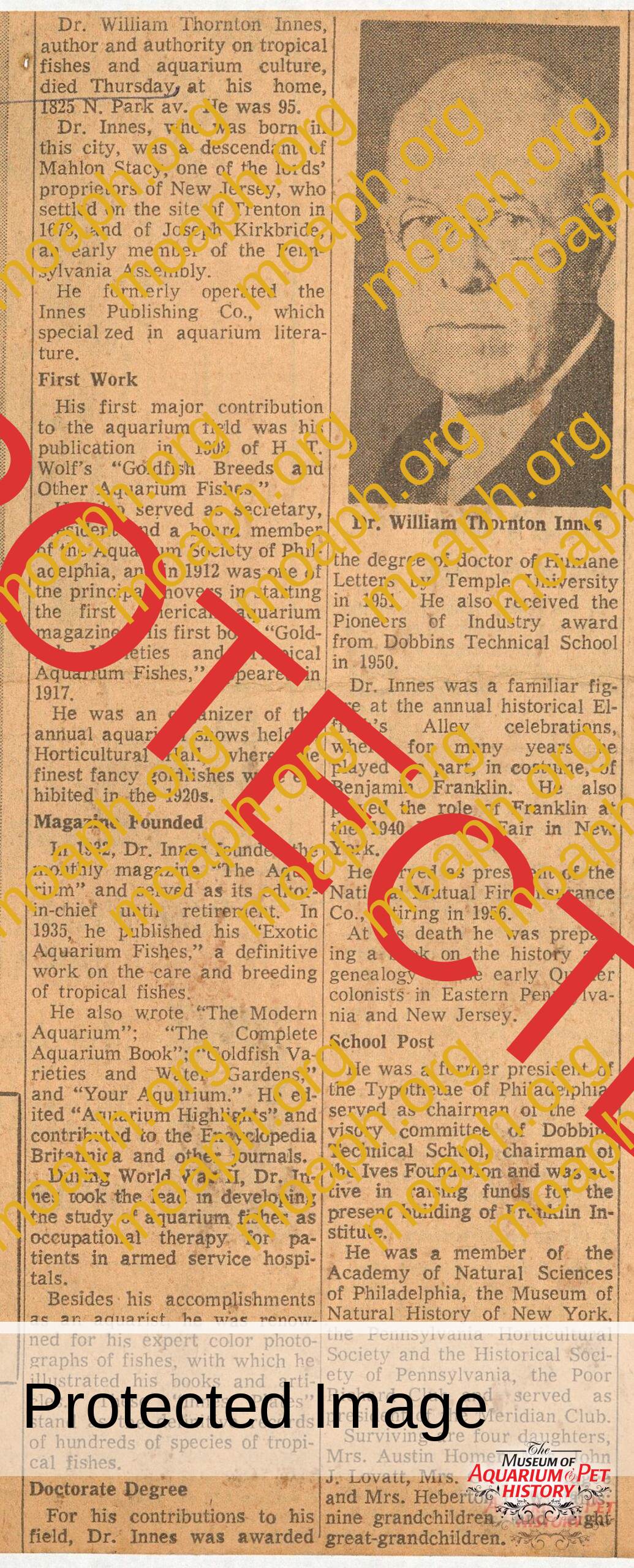 Obituary for Dr. William Thornton Innes, who died on February 27, 1969. Reprinted from the Philadelphia Evening Bulletin, Saturday, March 1, 1969.
