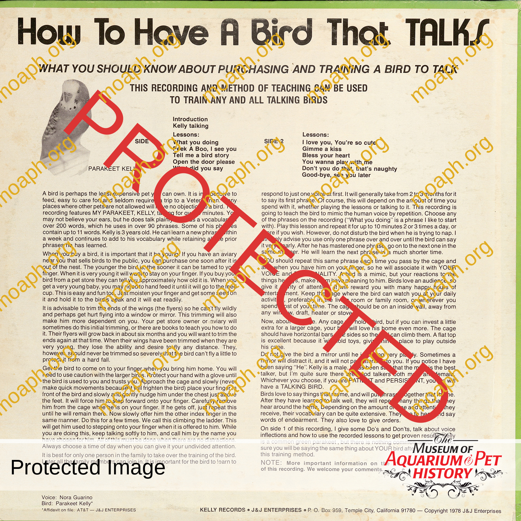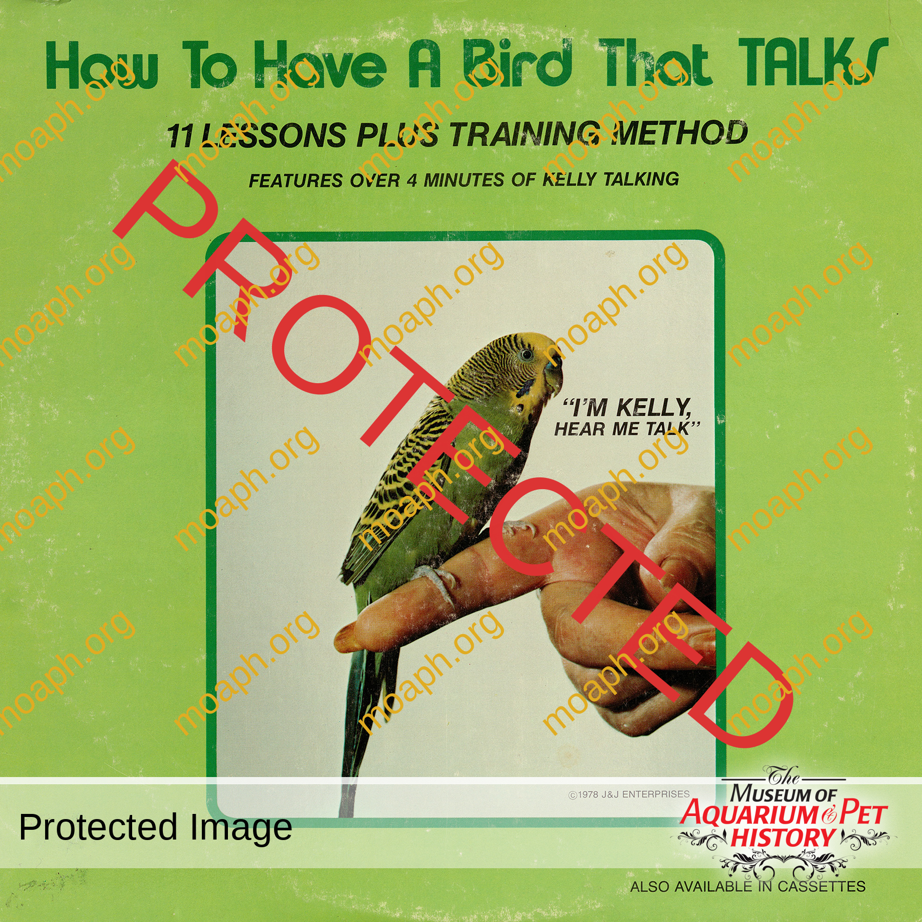 Record from 1978 that features Kelly the parakeet talking. Kelly knew over 200 words by the time he was 3 years old. The record also includes training phrases, and we’ve included an abridged version of those phrases to listen to (originally the repeated phrases ran for 30+ minutes!).