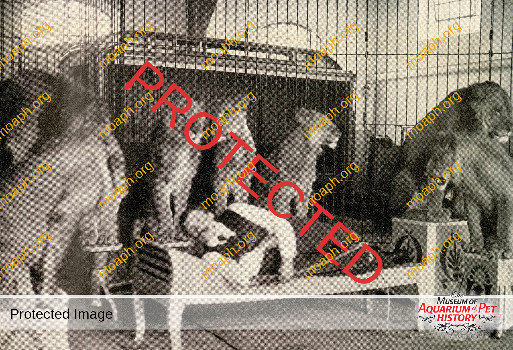 August Molker during the final rehearsal with a completed lion group after four months of work. No animal trainer after Molker has ever managed to bury themselves so calmly and unarmed under a pyramid of predators.