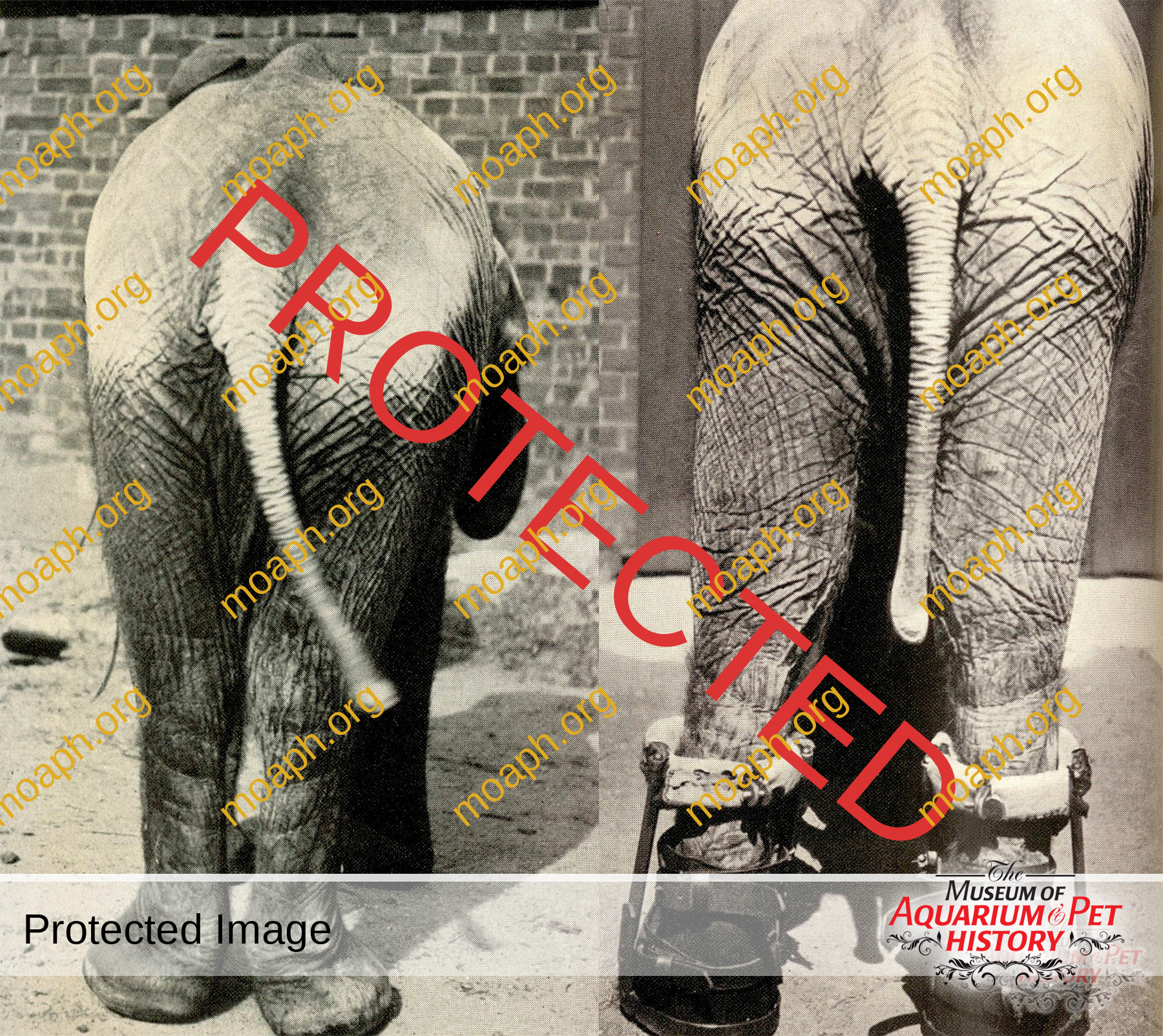A young rickety elephant has arrived from Africa (left). The bow legs were not overlooked but corrected. After a long period during which the animal has grown, the splinted legs are gradually beginning to straighten (right).
