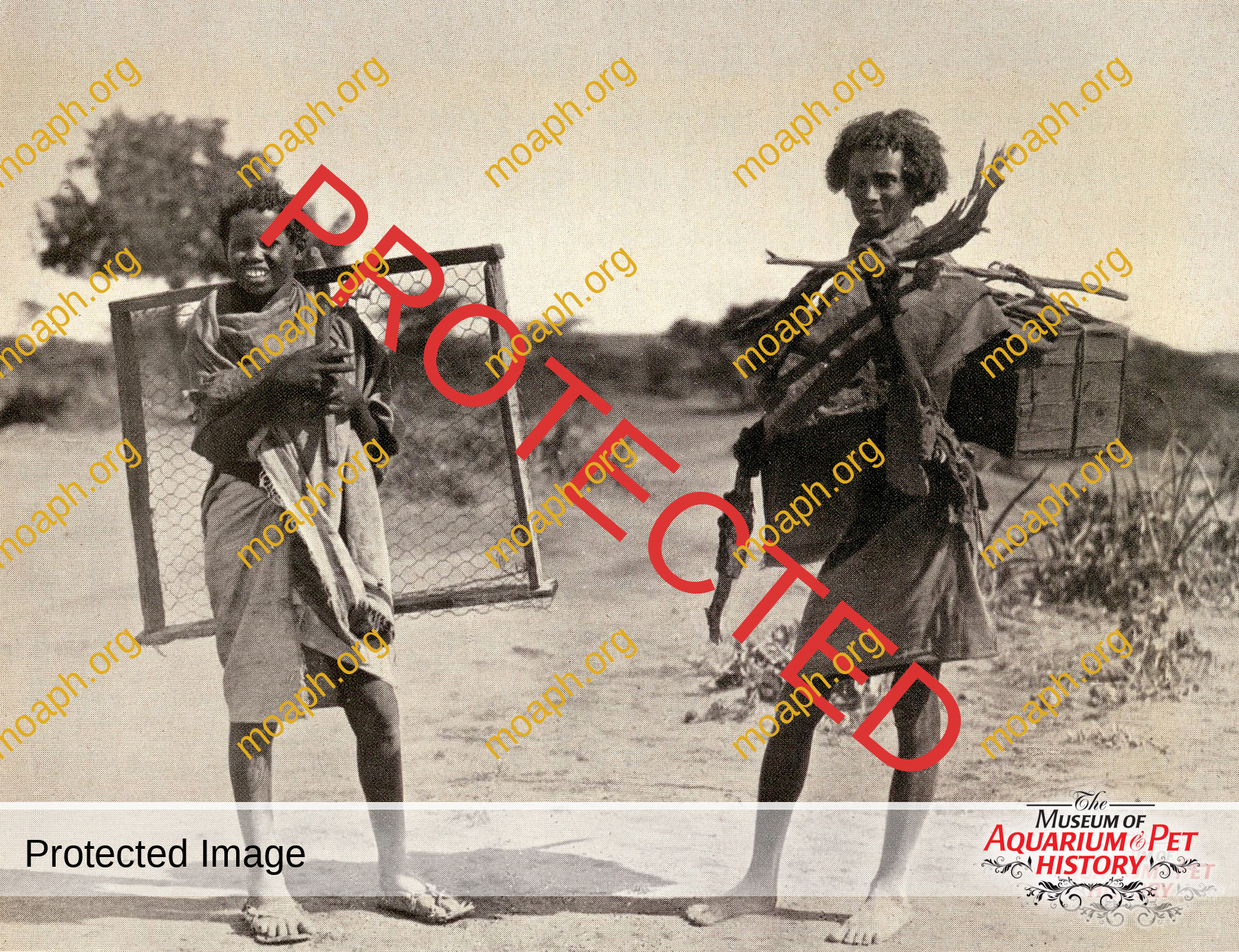 Native suppliers of the Ruhe company: Two Abyssinian bird catchers with a wire net intended for trapping and a transport box for the birds.
